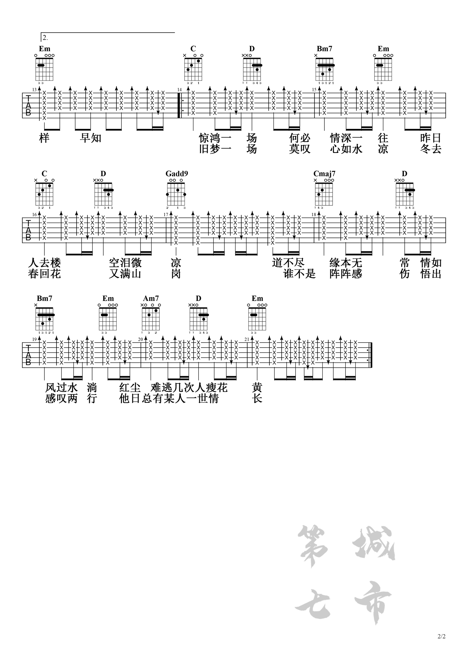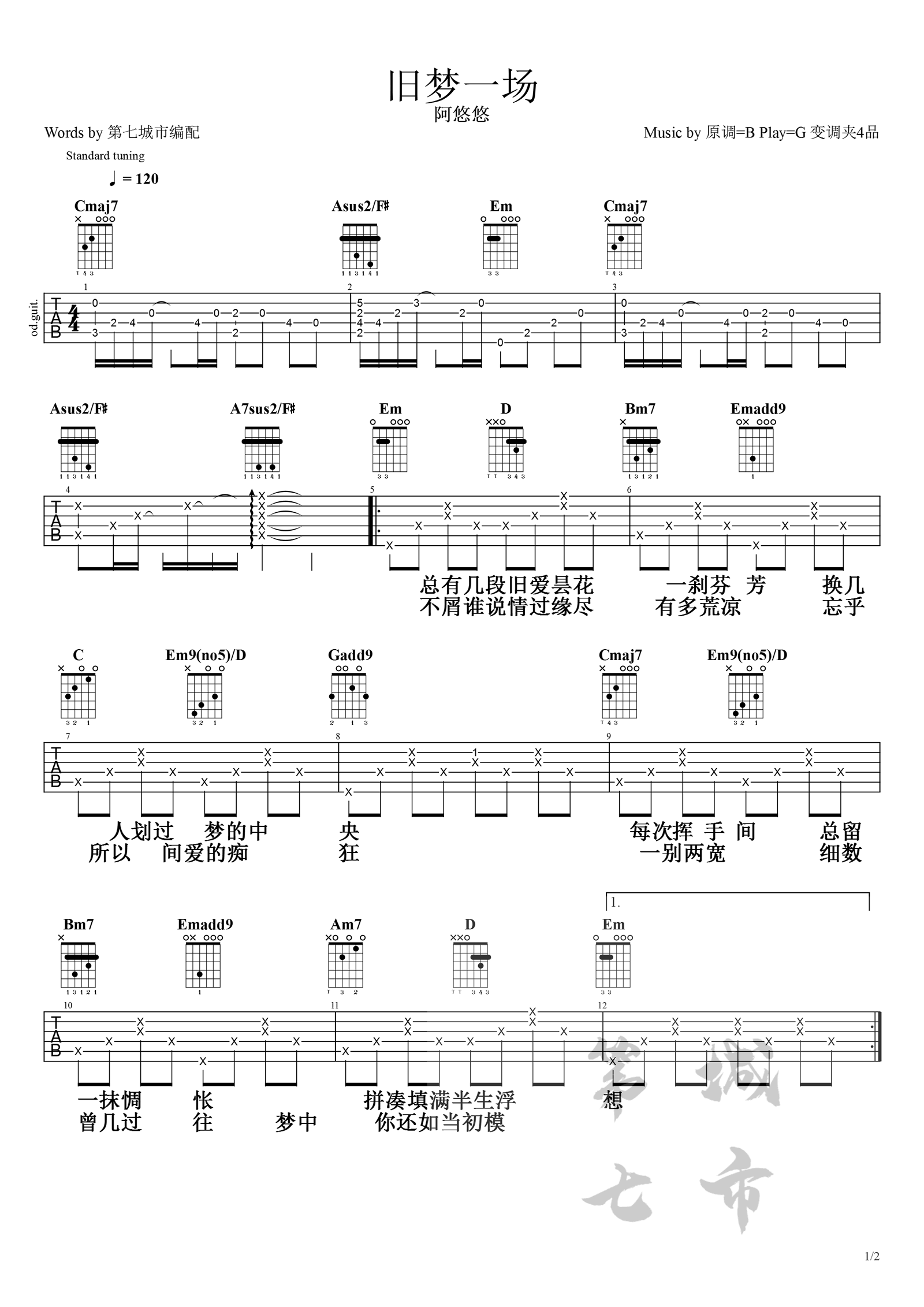 曲谱介绍: 《旧梦一场》,阿悠悠的一首热门网络歌曲,旧梦一场六线谱,原调B选调G,变调夹夹第四品。第七城市编配出品,琴谱网网更新上传。