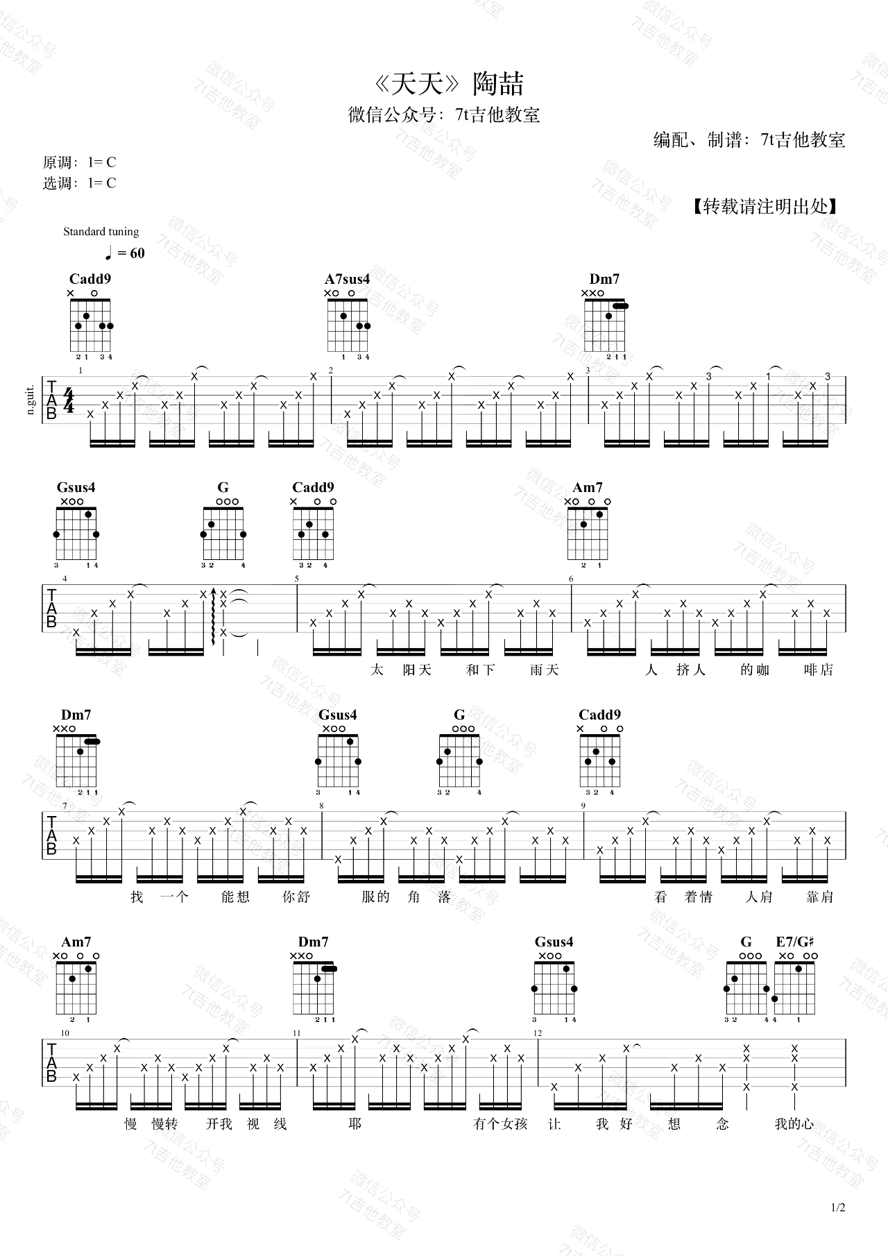 曲谱介绍: 《天天》,陶喆演唱的一首经典老歌,这首歌的原调是C大调,谱子也是用C大调来编配,视频里是标准音调弦,变调夹夹在第3品,适合音域较高的女生,唱不了那么高的小伙伴可以少夹几品,或者不夹变调夹也可以哦! 7T吉他教室编配出品,琴谱网网更新上传。 一首融合布鲁斯的流行音乐。吉他声响起,相隔两地的思念已经被暖暖的融化了。随谱附上蜜汁叉烧肠示范演唱视频,真的很好听哦! 演奏提示,右手节奏型琴友们可以自由发挥,不必完全按照谱子上的来。