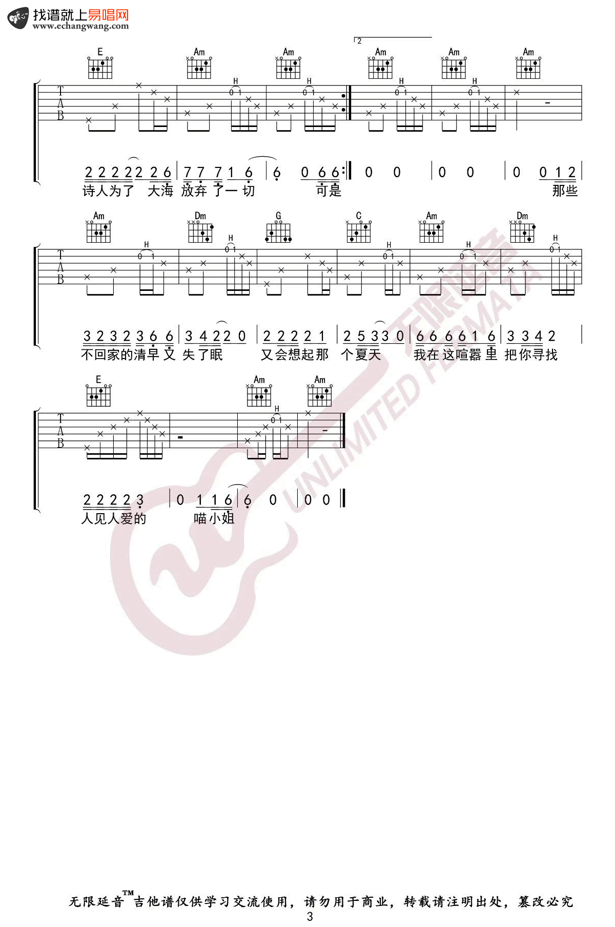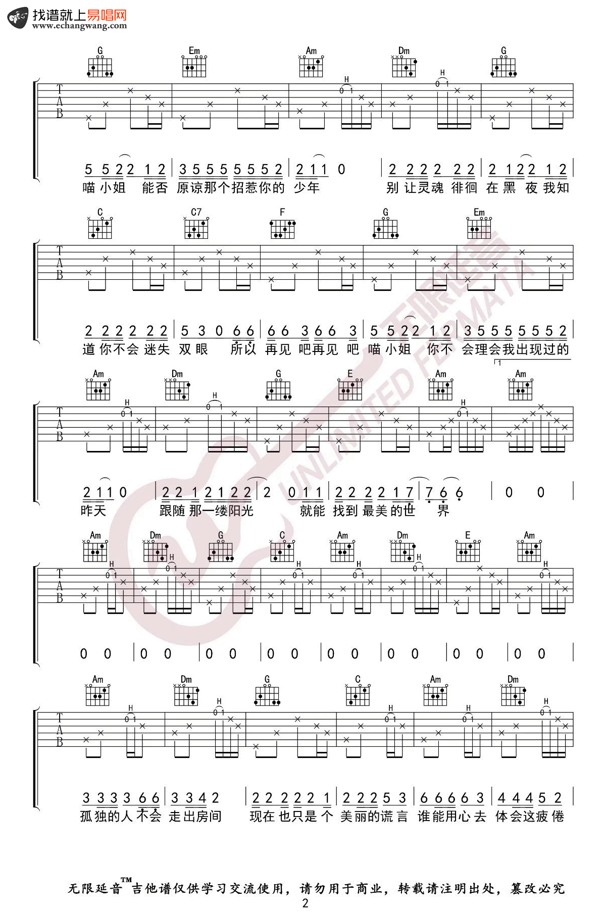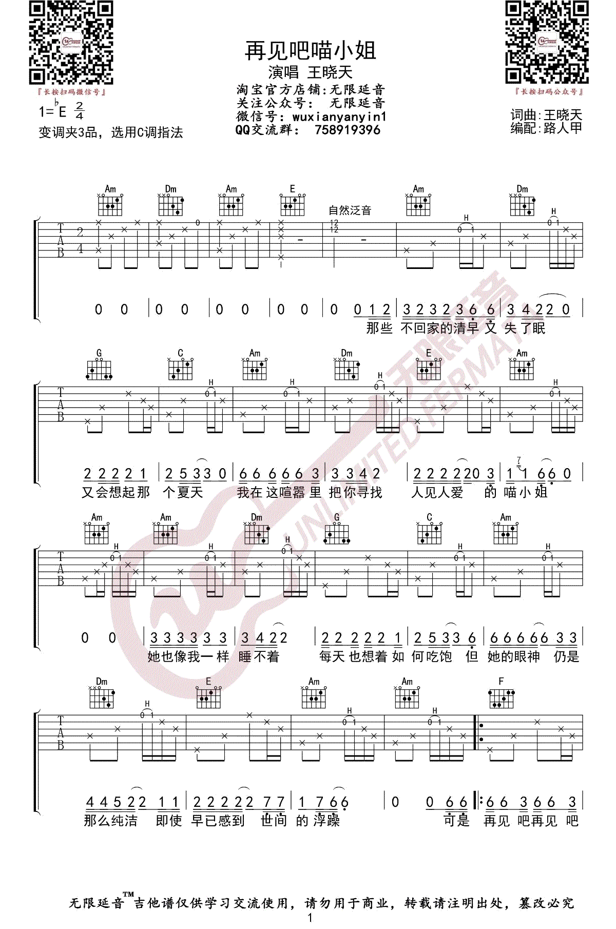 曲谱介绍: 王晓天《再见吧喵小姐》吉他弹唱谱,共有3张高清图谱。