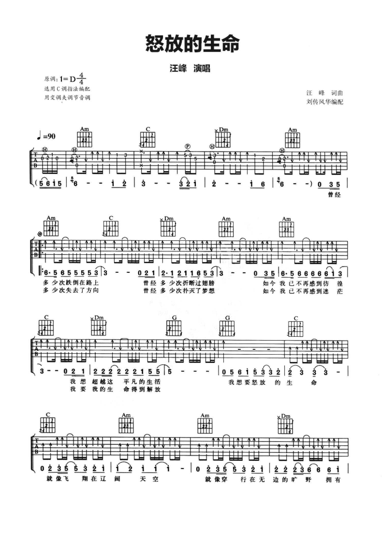 曲谱介绍: 汪峰《怒放的生命》吉他谱_C调吉他弹唱谱_双吉他版