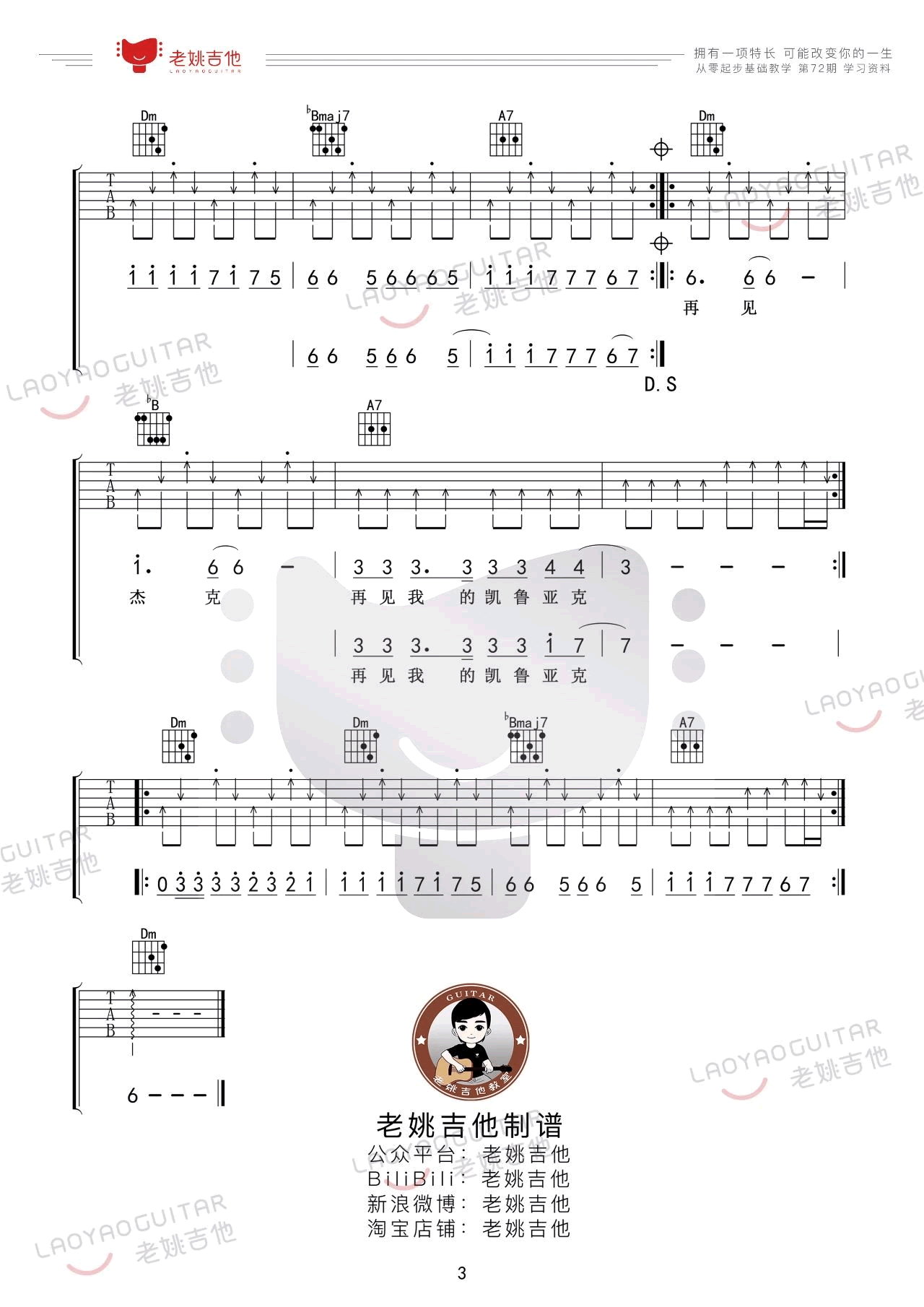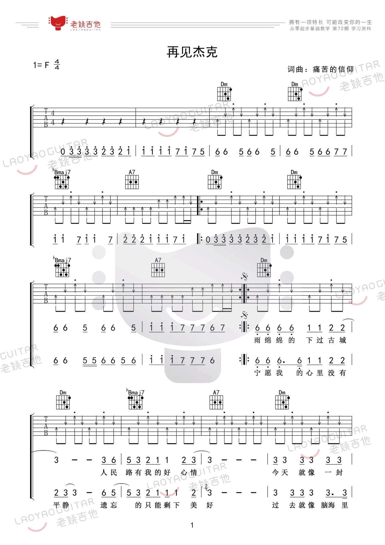 曲谱介绍: 《再见杰克》,痛仰乐队的一首代表歌曲,在《乐队的夏天》中,痛仰凭着一首《再见杰克》拿到了第二期的第一名。再见杰克六线谱,F调弹唱谱,闷音旋律练习练习,三张图片谱,老姚吉他编配出品,并带来弹唱教学视频,琴谱网网上传更新。 摇滚乐不只是负面的宣泄,更应该给人一种积极的、向上的力量。别了凯鲁亚克,就是挥别我们的过去,那是你我人生的一部分,无关好坏,只有饱含激情的去缅怀。