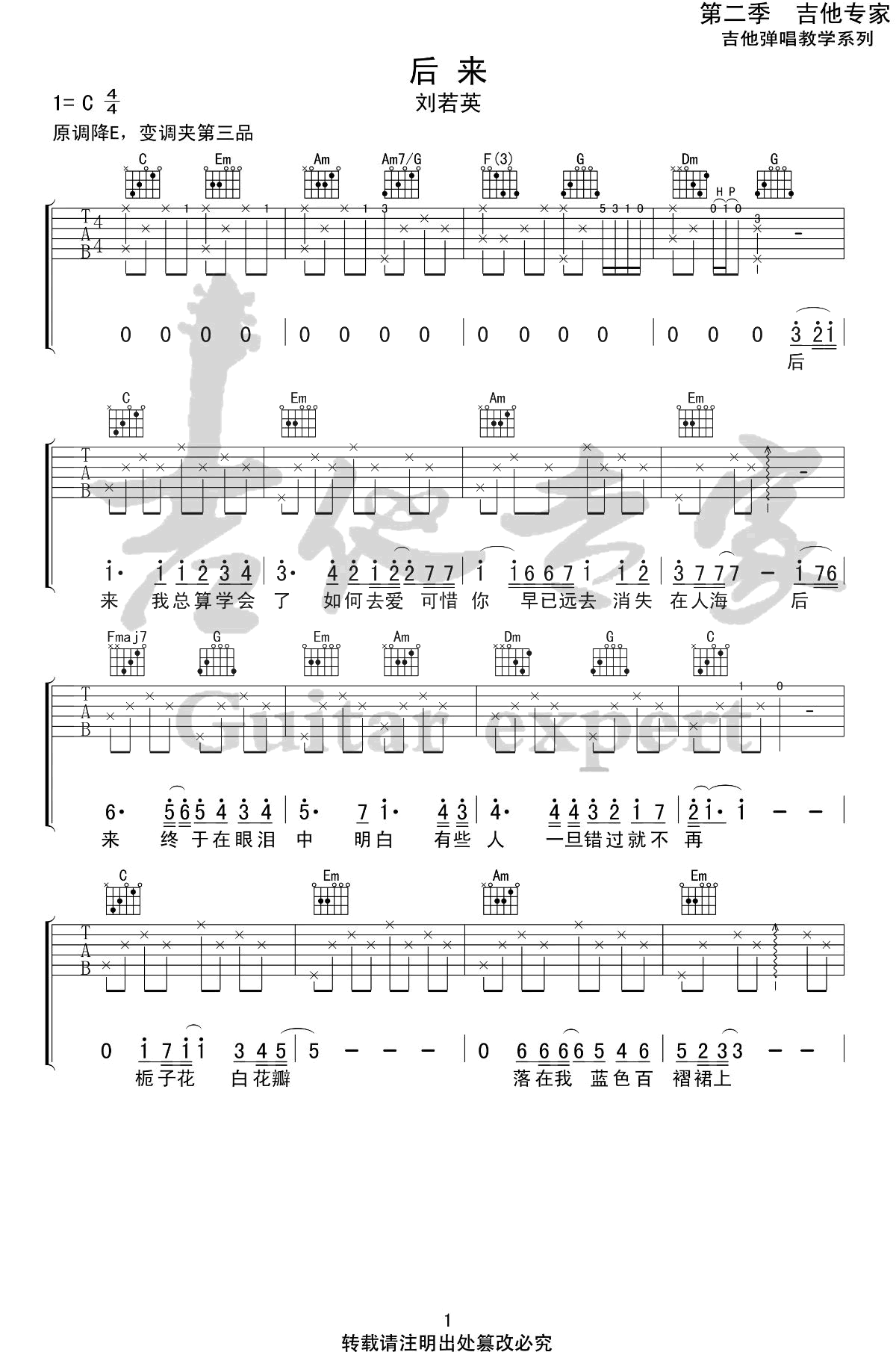 曲谱介绍: 《后来》,前奏间奏不难,喜欢的不要错过。刘若英的代表歌曲,后来六线谱,原调降E,选用C调指法,变调夹第三品。吉他专家编配出品,琴谱网网更新上传。 一首红遍大江南北的《后来》,承载了所有我们关于青春的回忆。17岁的那个少年,一旦爱了总是惊天动地,长大后的我们,终于学会了如何去爱,可我们,再也没有了后来.....