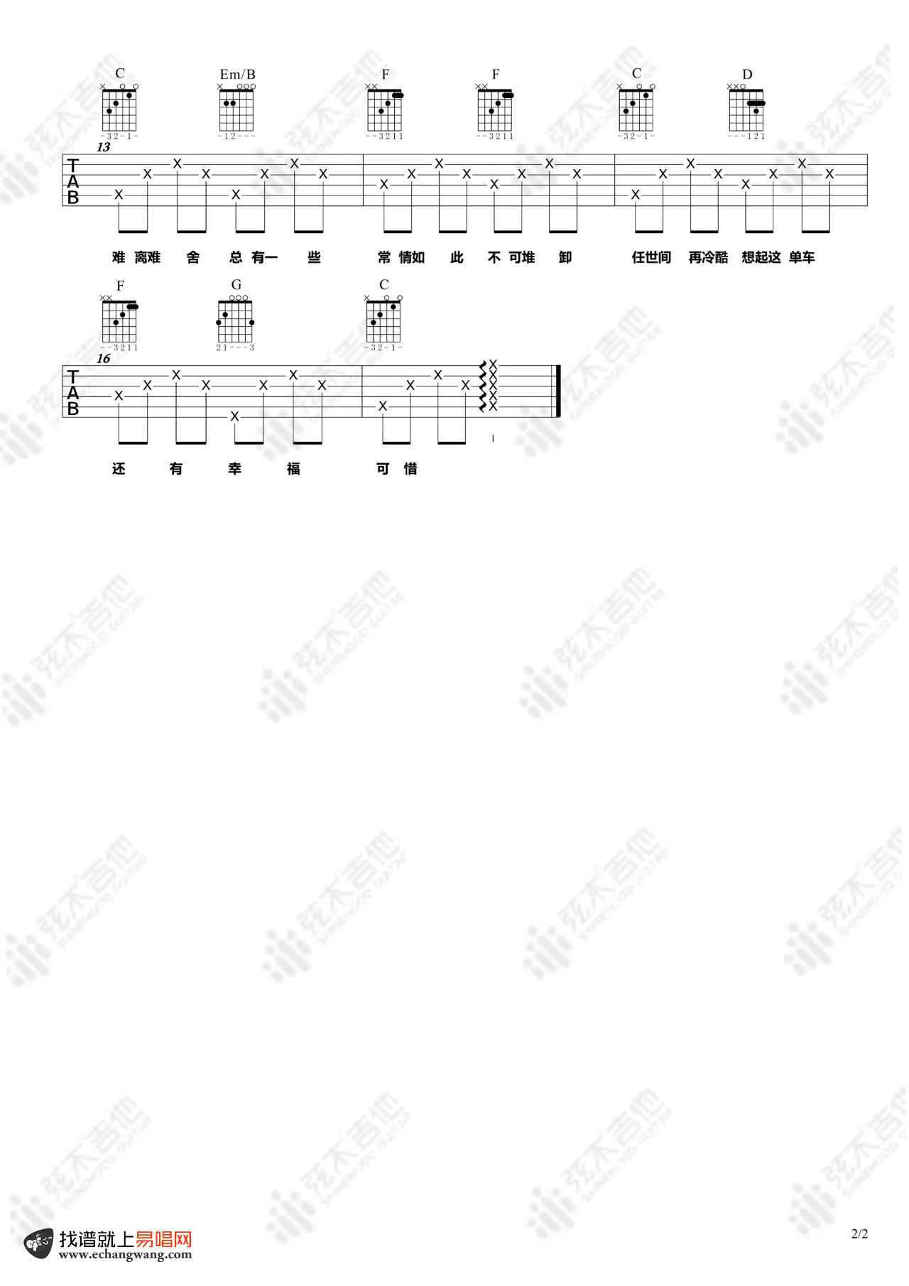 曲谱介绍: 陈奕迅《单车》吉他弹唱谱,共有2张高清图谱,免翻页排版设计。