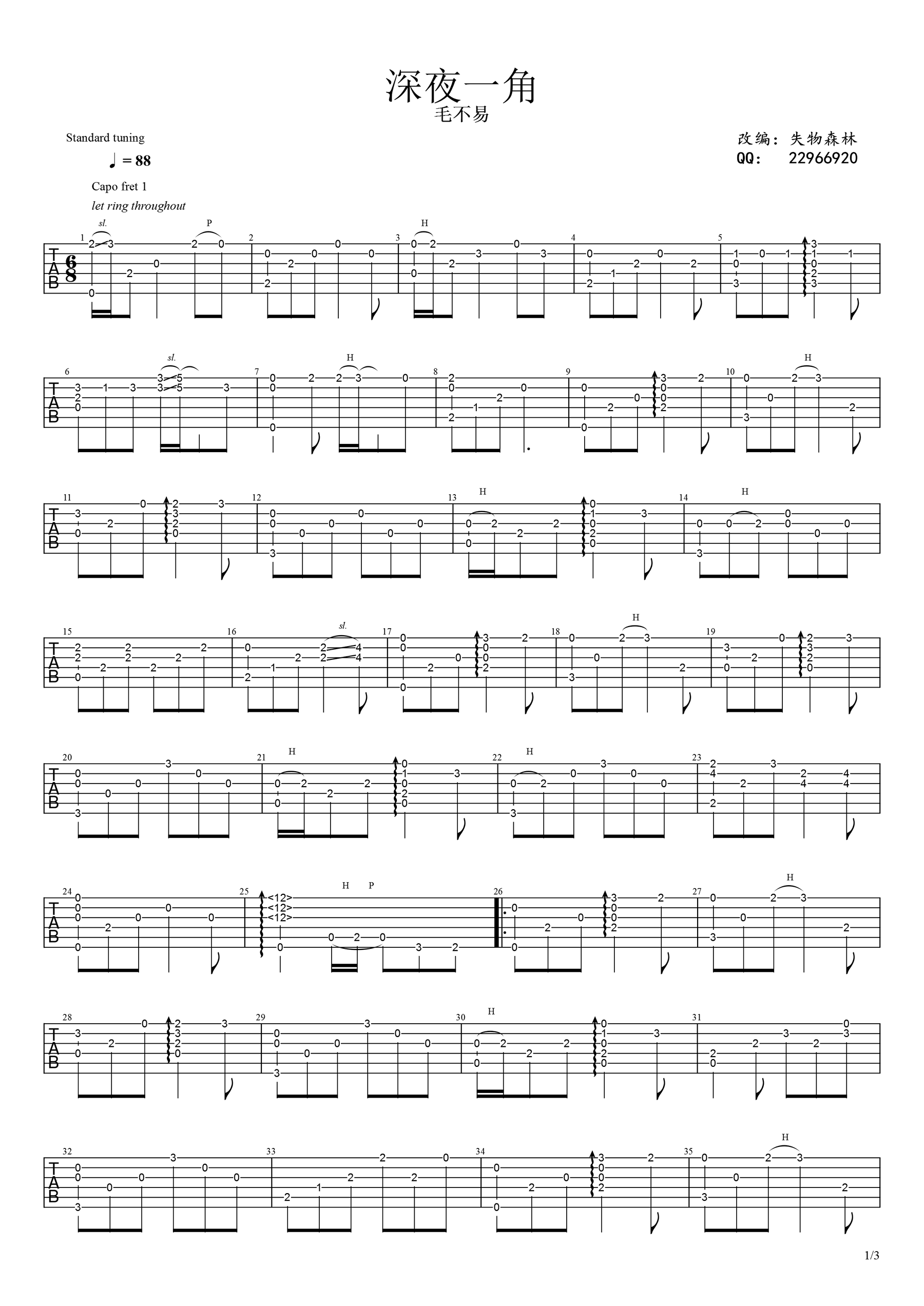 曲谱介绍: 毛不易《深夜一角》吉他独奏谱,共有3张高清图谱。