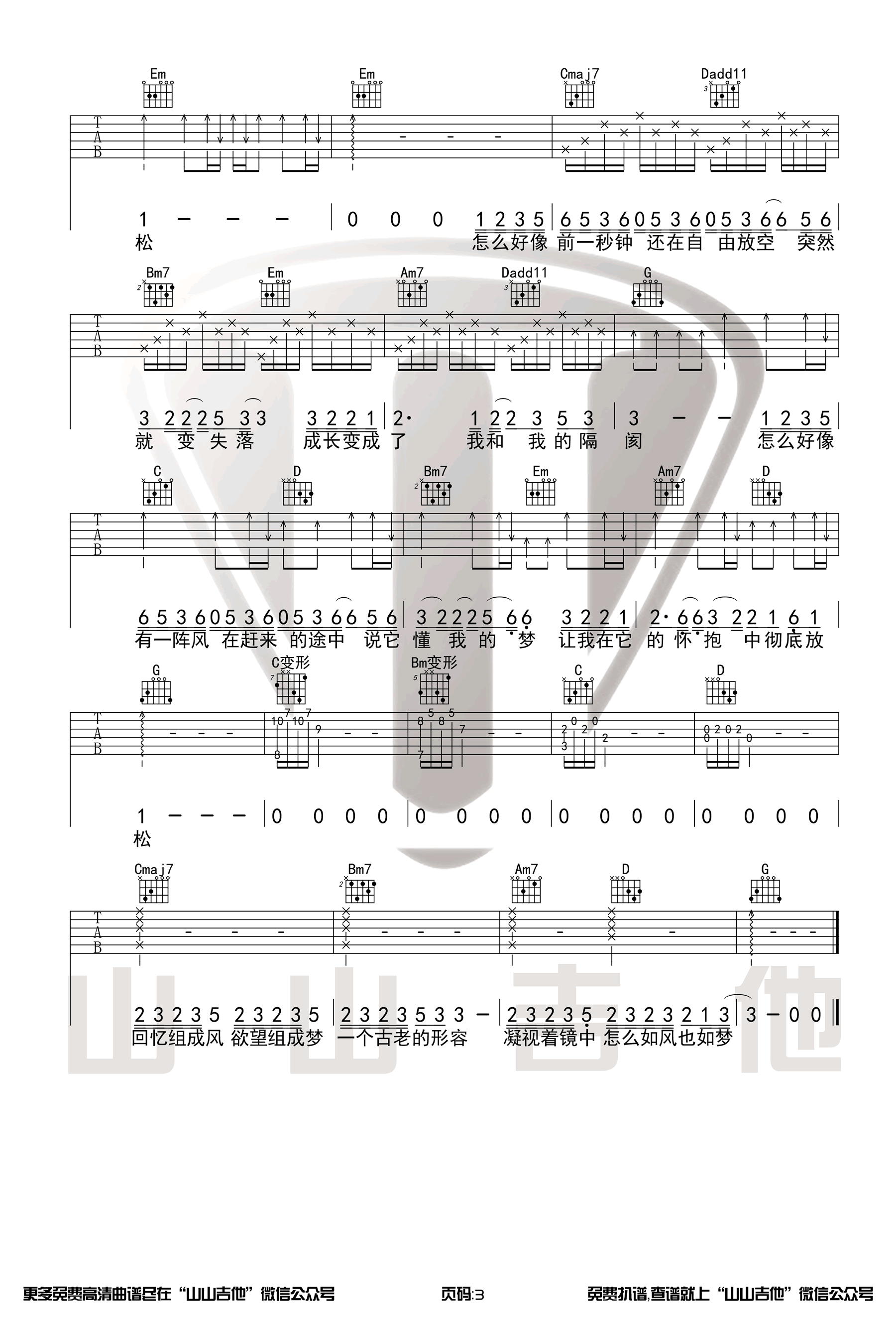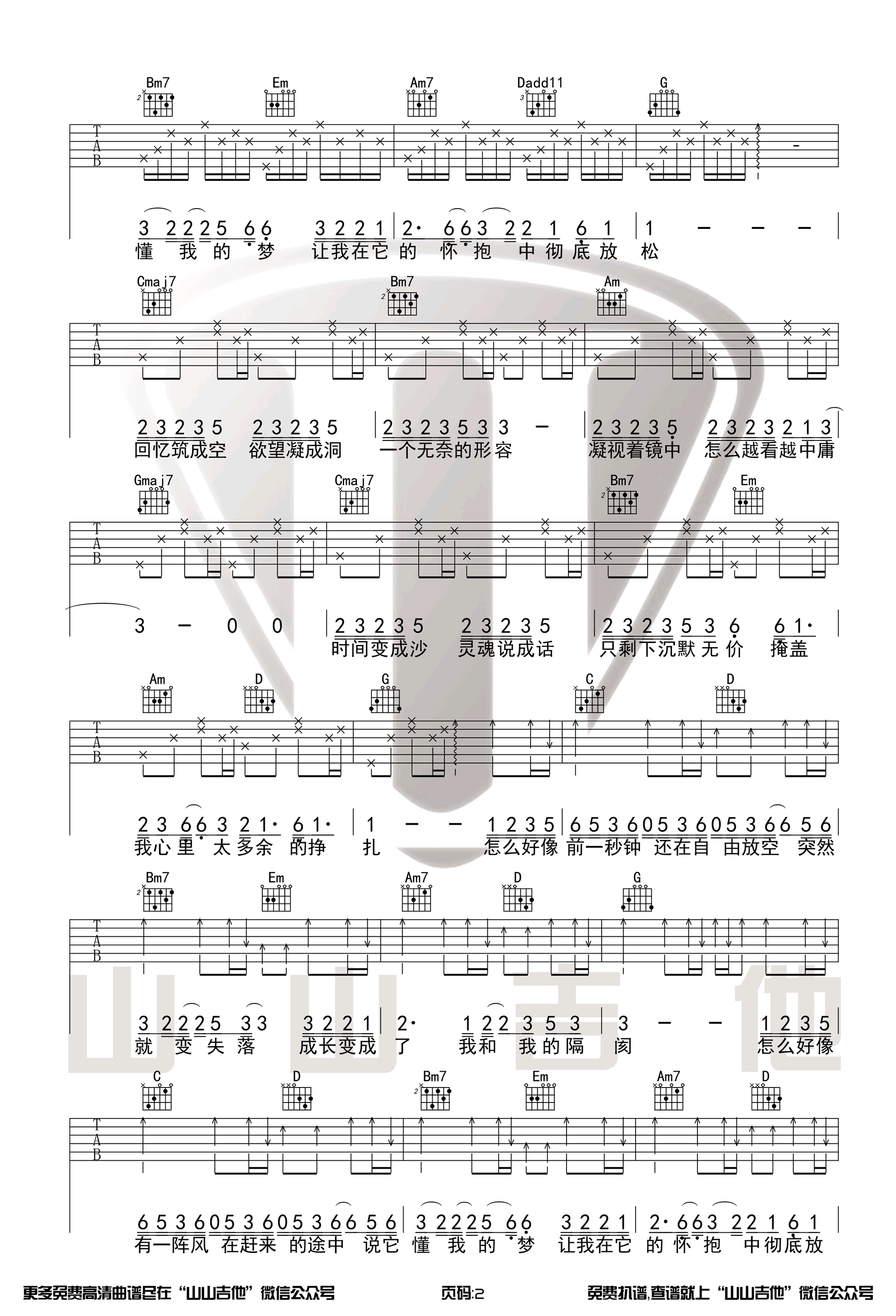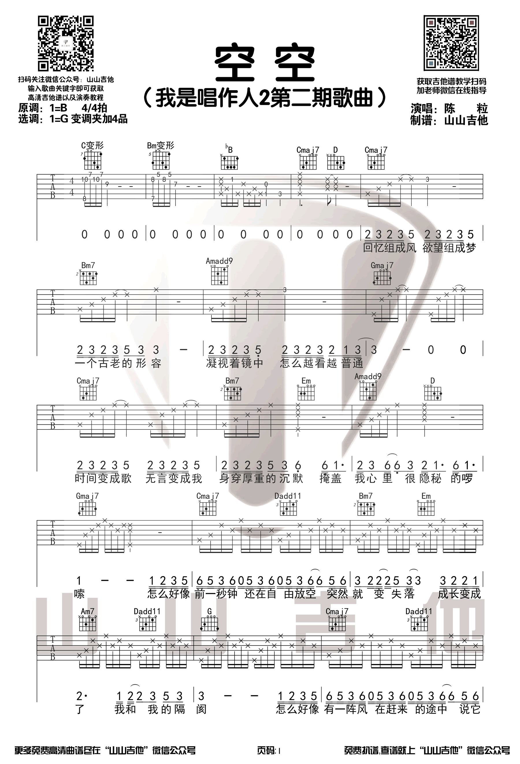 曲谱介绍: 《空空》,陈粒演唱,原创音乐的节目《我是唱作人》中的一首歌曲。空空六线谱,选用G调指法编配,变调夹夹第四品,三张弹唱图片谱,感谢山山吉他出品,琴谱网网更新上传。 这首歌一经演唱就收获了众多网友的喜爱,今天我们就带来了这首歌的原版。山山老师为大家录制了演示视频,喜欢这首歌的朋友们可以拿起练起来啦~