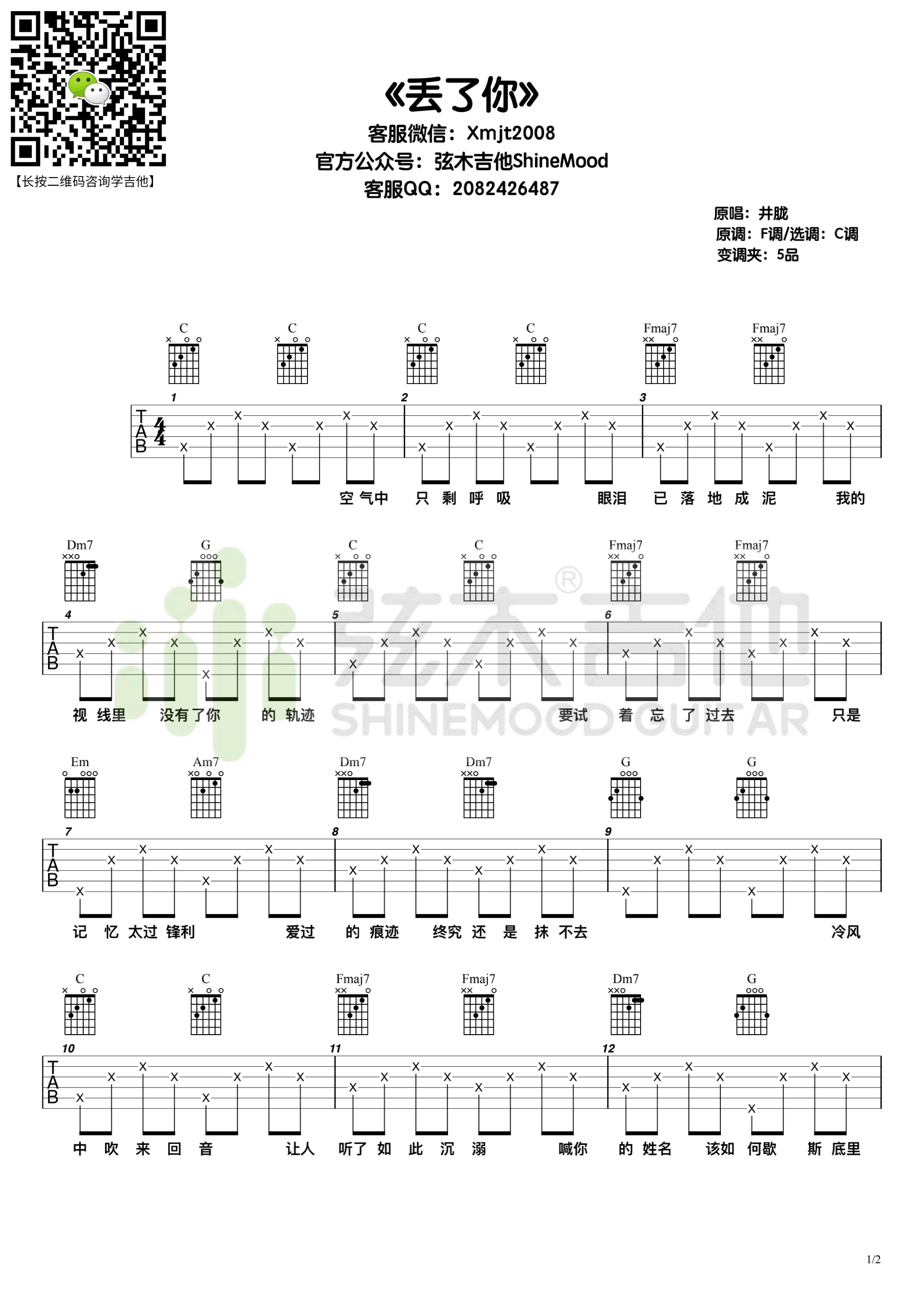 曲谱介绍: 《丢了你》,井胧演唱的一首伤感情歌,丢了你六线谱,原调F选用C调,变调夹夹第五品,两张弹唱图片谱,弦木吉他编配,琴谱网网整理上传。 深情男声完美演绎,给你我对难舍往事最深的共鸣和感动,我总在每一个黑夜想你,嘲笑自己傻得可以,井胧充满磁性和故事的嗓音,一开嗓就让人难以忘怀。
