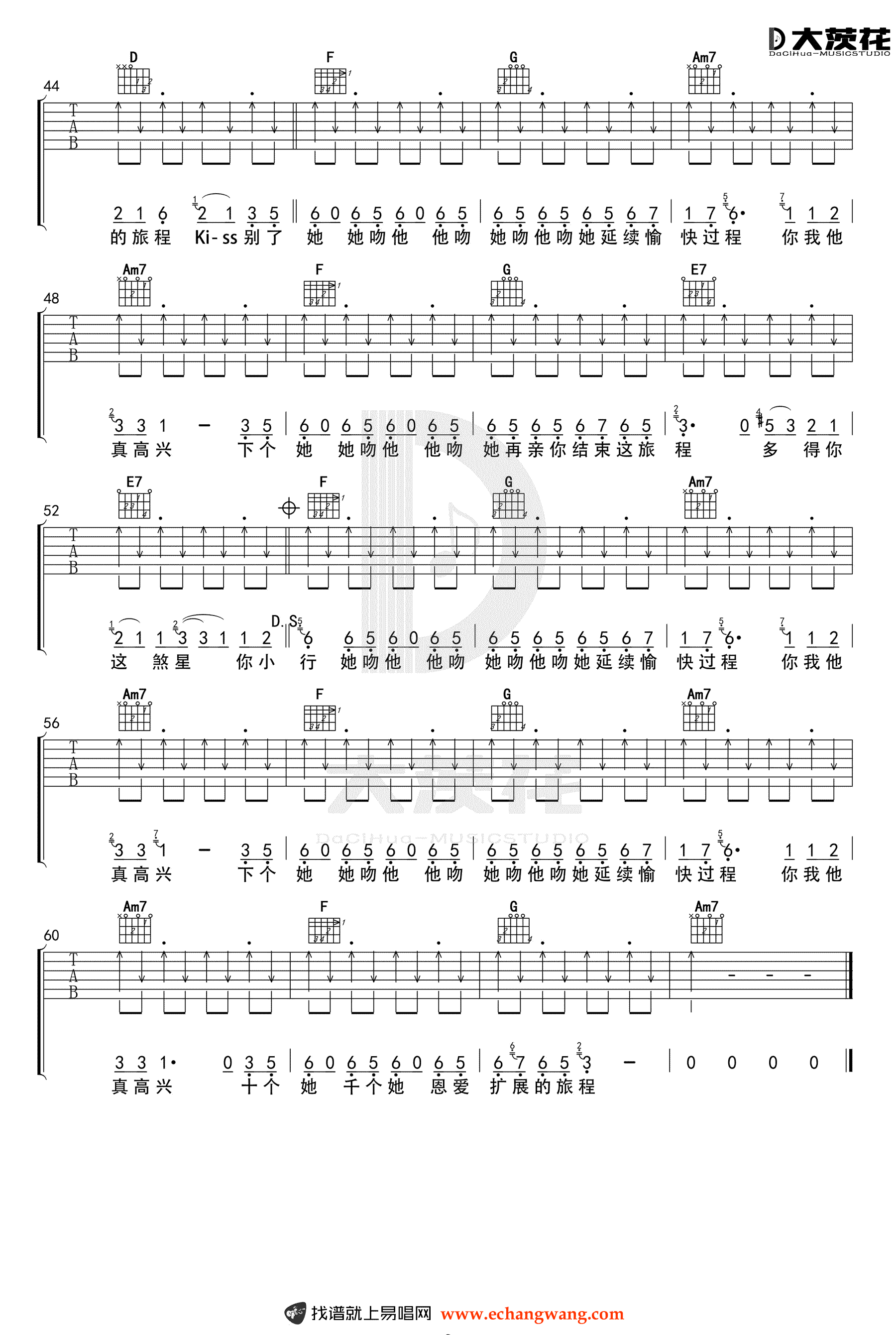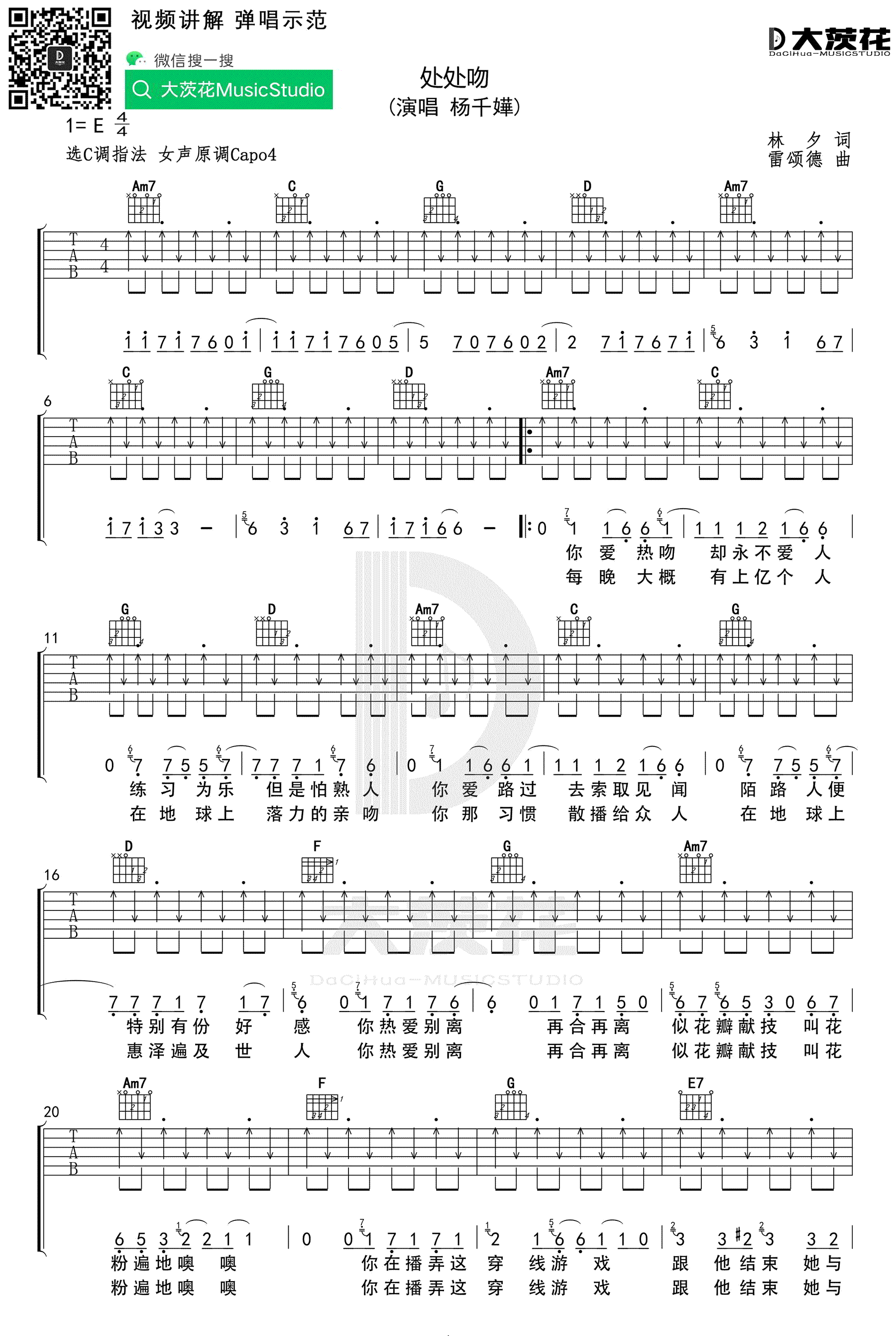 曲谱介绍: 杨千嬅《处处吻C调》吉他弹唱谱,采用C调指法编配,共有3张高清图谱。