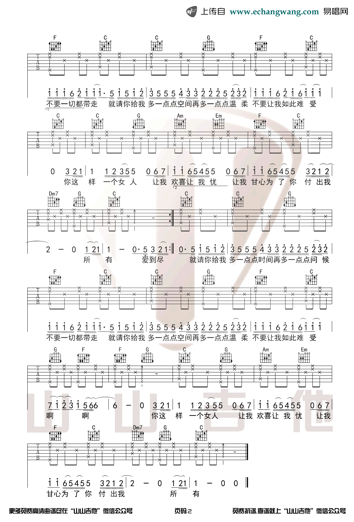 曲谱介绍: 《让我欢喜让我忧》,周华健的一首经典老歌,改编自日本组合恰克与飞鸟的《男と女》,让我欢喜让我忧六线谱,C调编配,变调夹夹第二品。两张图片谱例。山山吉他出品,更新上传。 认识周华健是从这首歌曲开始的,生活是五味杂陈的交响曲,有时欢喜有时忧,生命是一值得回味怀旧的歌谣,在熟悉的旋律里,我们一直在一起。