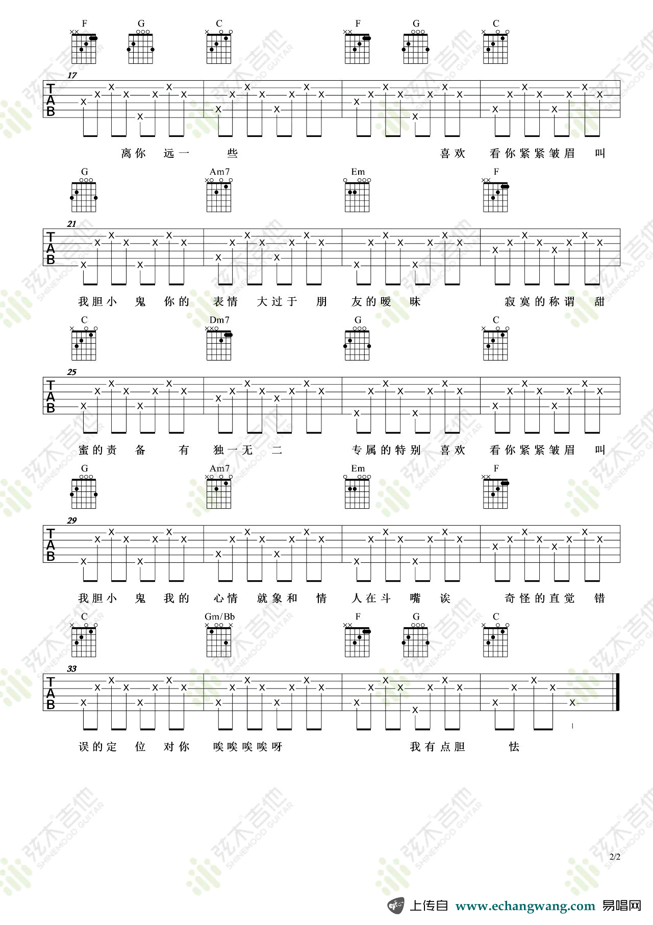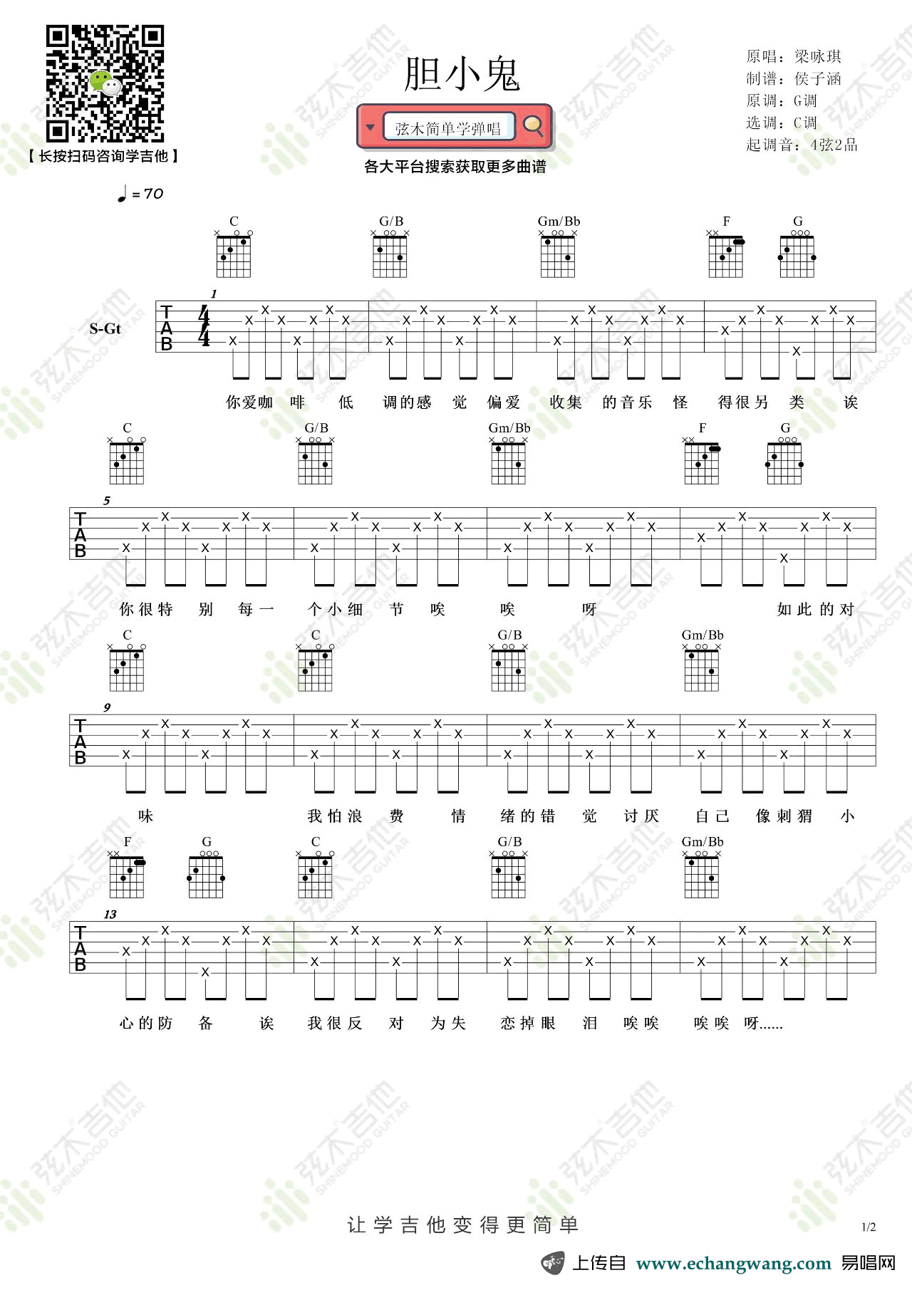 曲谱介绍: 梁咏琪的一首经典代表歌曲,胆小鬼,原调G选用C调,起调音四弦二品。胆小鬼谱,两张图片六线谱,弦木吉他制谱出品,琴谱网网上传更新。 清新如风的歌曲,唱出爱情世界里男孩跟女孩的小暧昧,每次听这首歌,有欢快,小忧伤,小情绪,好多感觉在里面掺杂着,轻快的旋律和歌词给人甜蜜味道,唤起无数人关于青春的美好回忆。