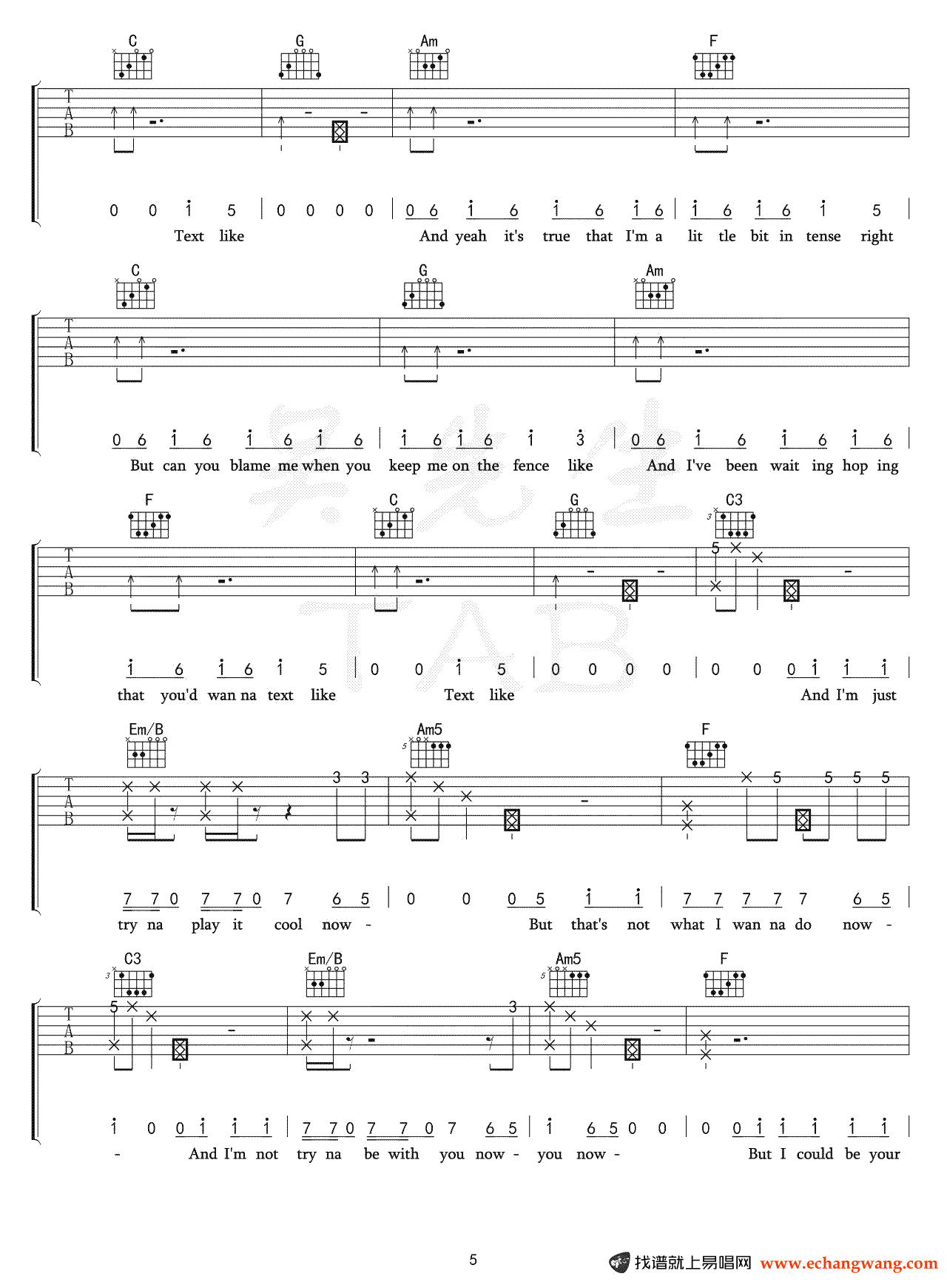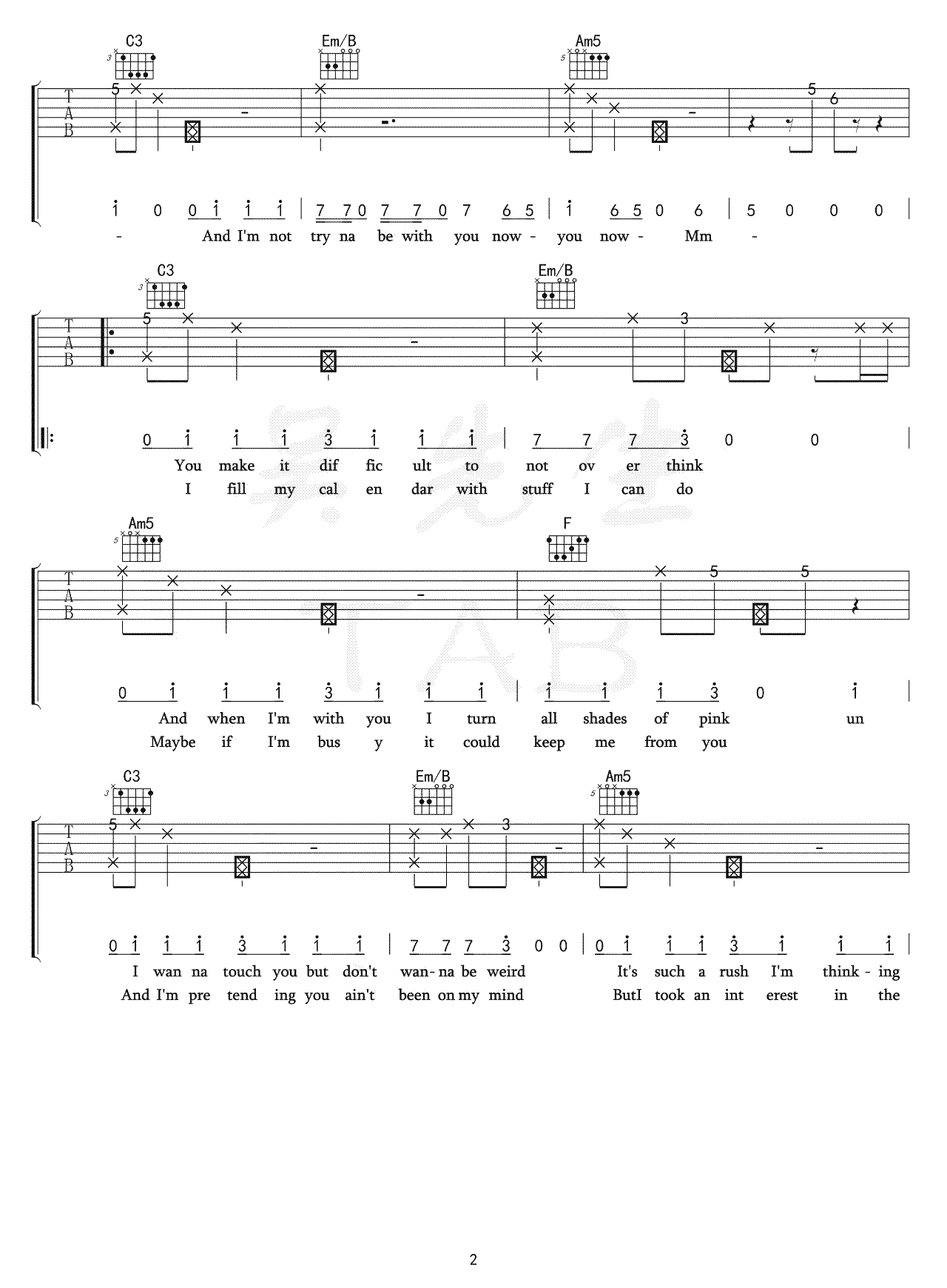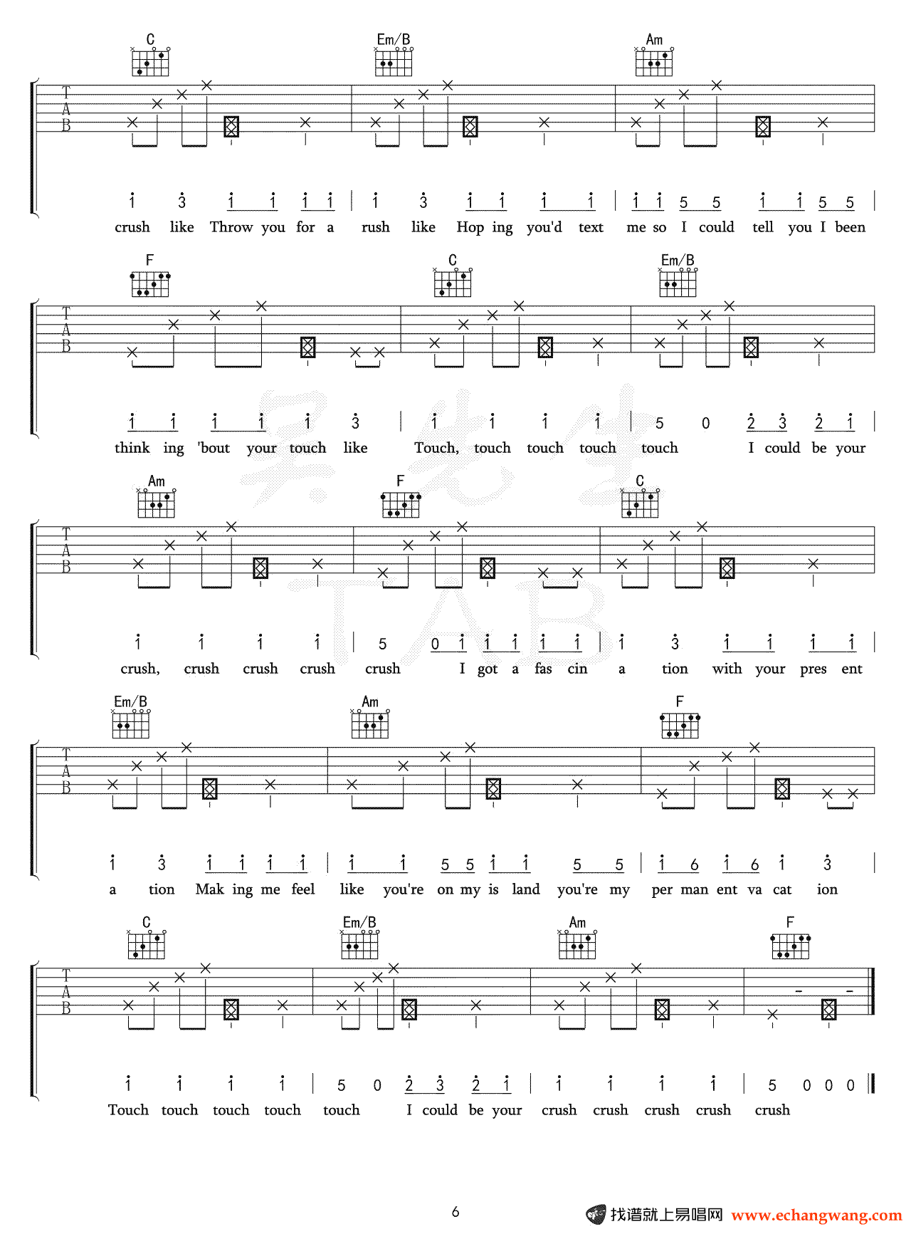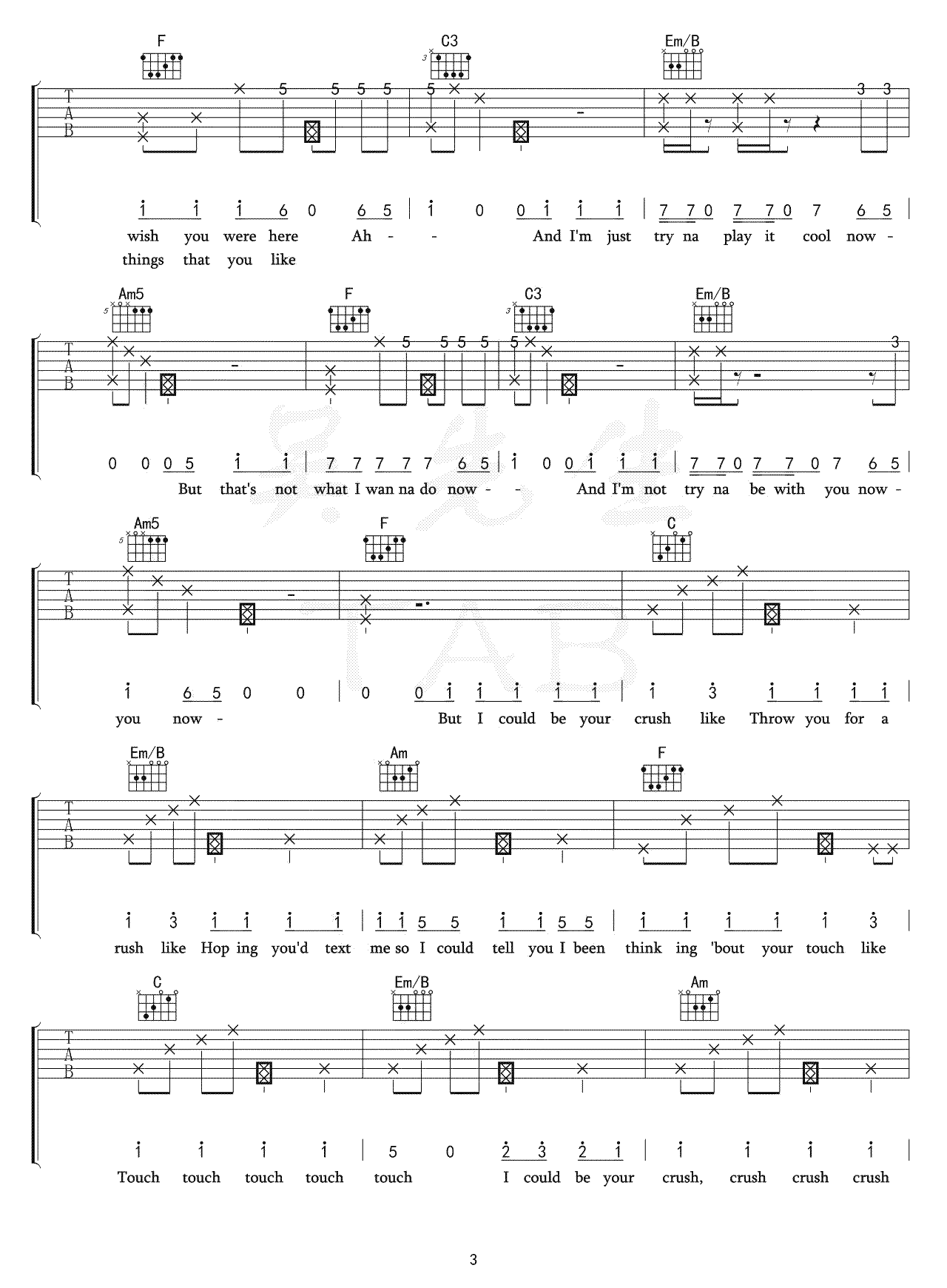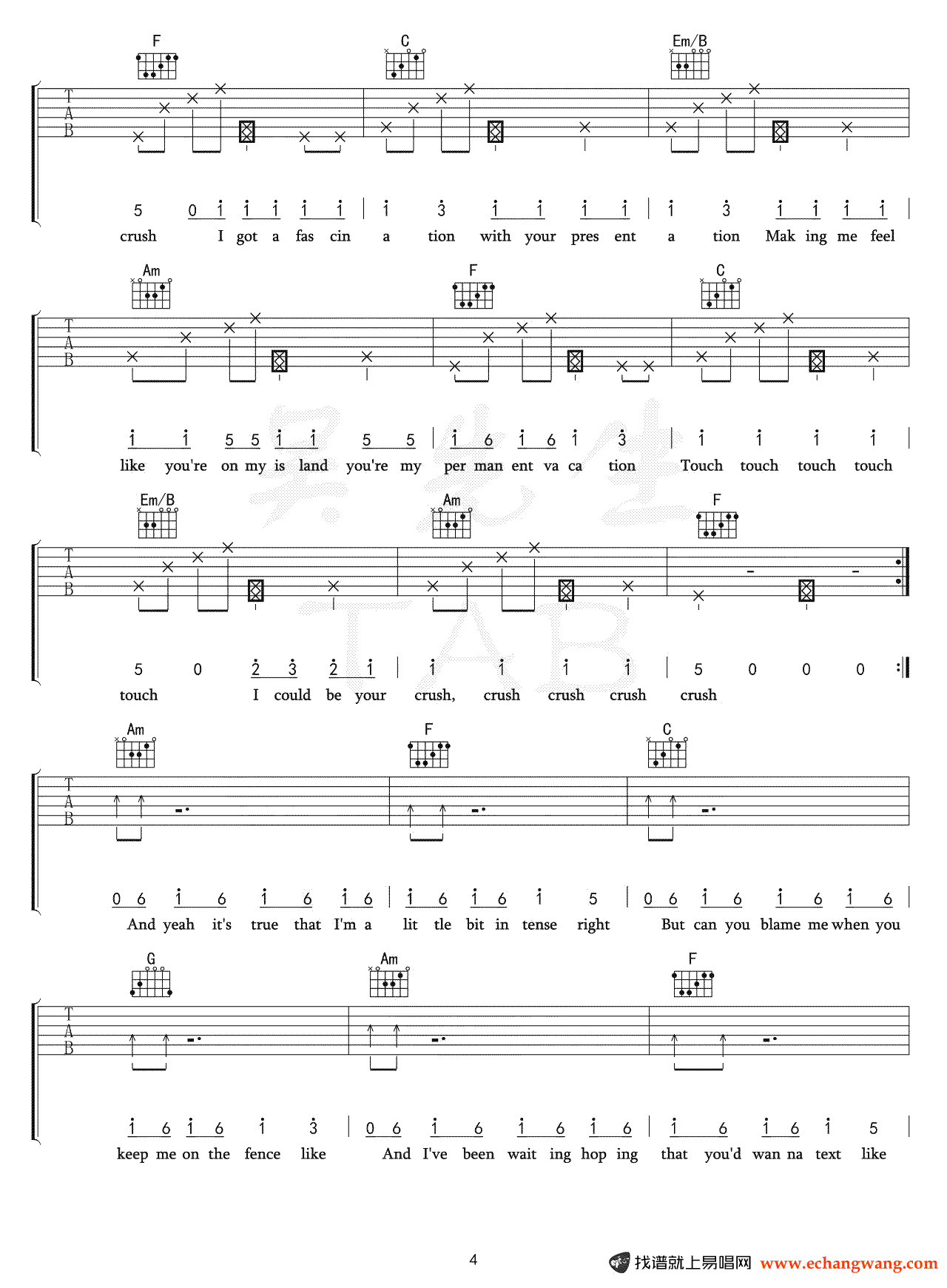 曲谱介绍: Tessa《Crush》吉他弹唱谱,共有6张高清图谱。