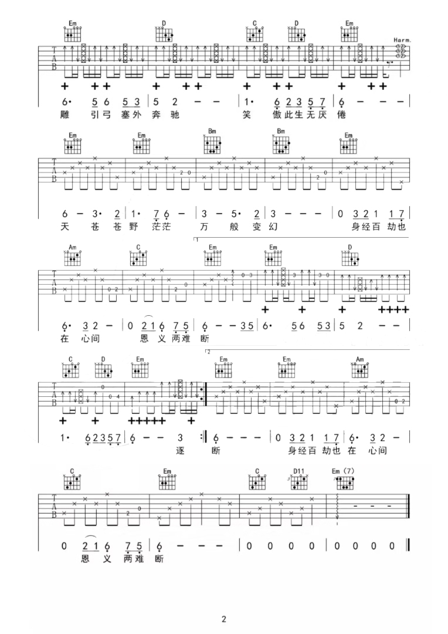 曲谱介绍: 弹奏提示:前奏很简单,主歌分解节奏注意低音过渡要弹得重一些,模仿原版效果;谱子中用到了打板扫弦节奏,学会了这些技巧很多的歌曲里都能通用。小间奏是带打板扫弦的编配,也不太难,需要慢慢练习熟练。