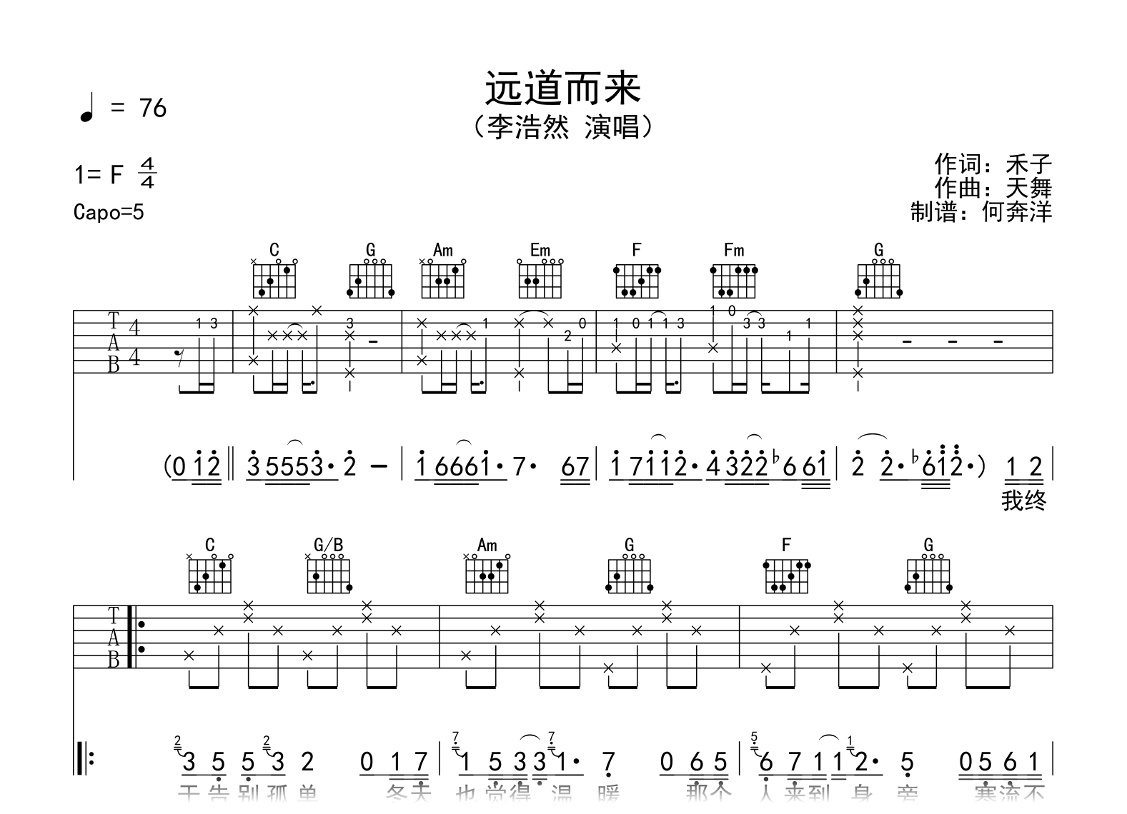 曲谱介绍: 远道而来吉他谱,李浩然演唱,《远道而来》吉他弹唱谱,原调F,选用C调指法编配,Capo5品,六线谱完整版共三张高清图片谱例。