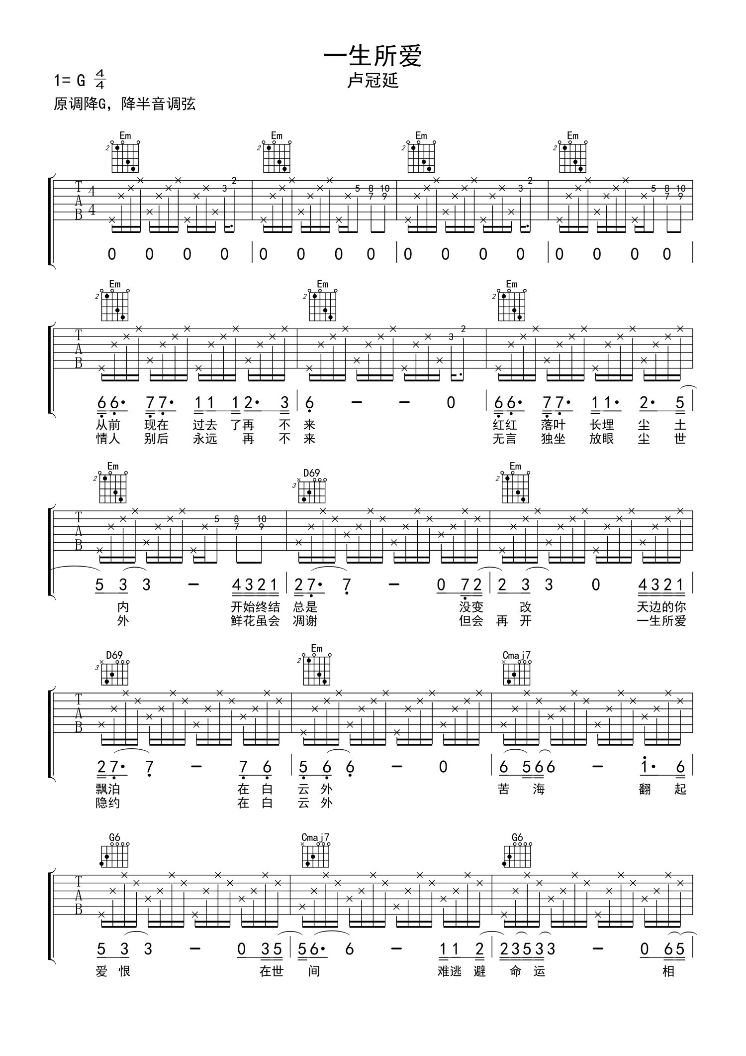 • 一生所爱吉他谱 - 卢冠廷 - G调吉他弹唱谱第1张