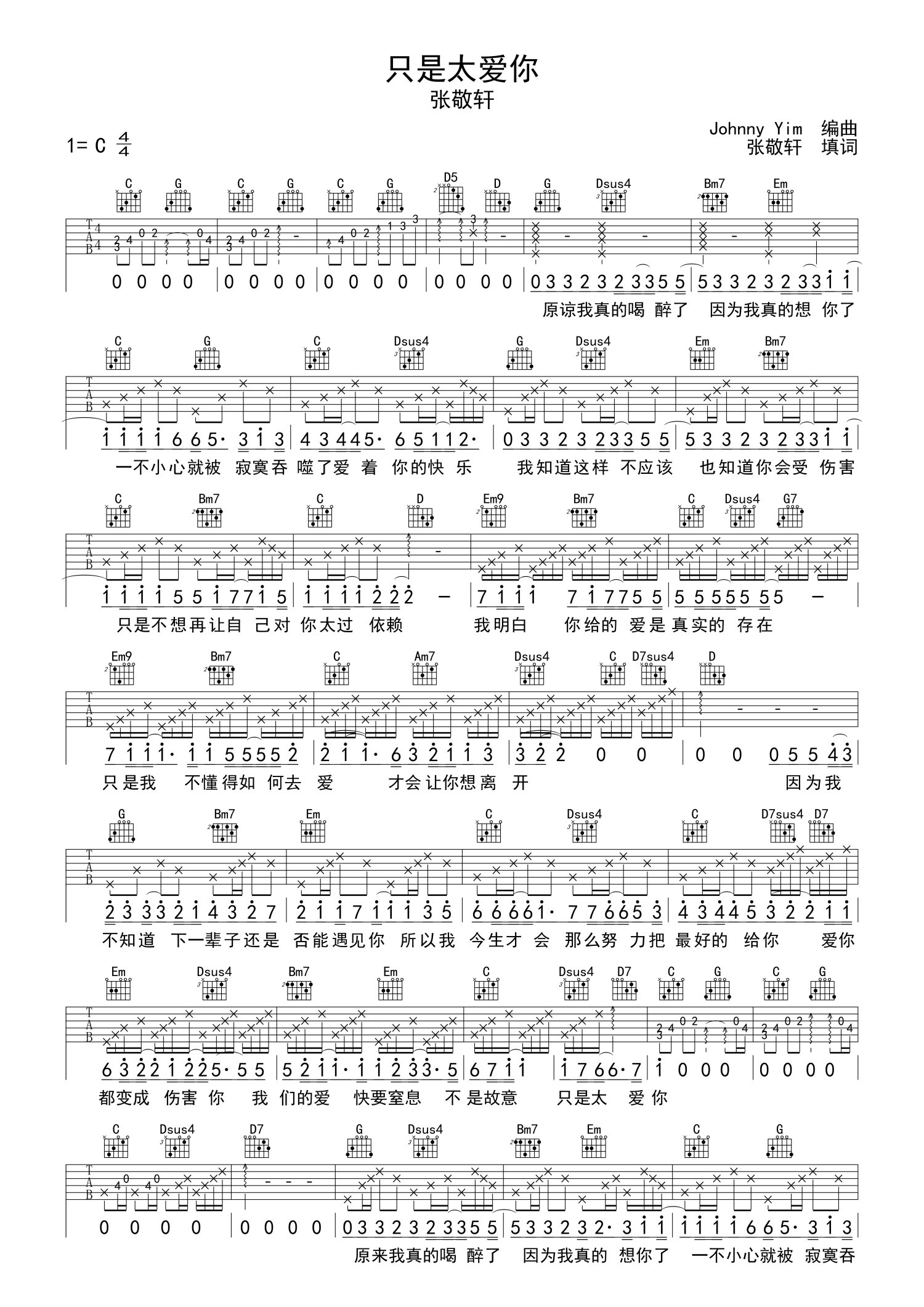 曲谱介绍: 张敬轩《只是太爱你》吉他谱_C调吉他弹唱谱