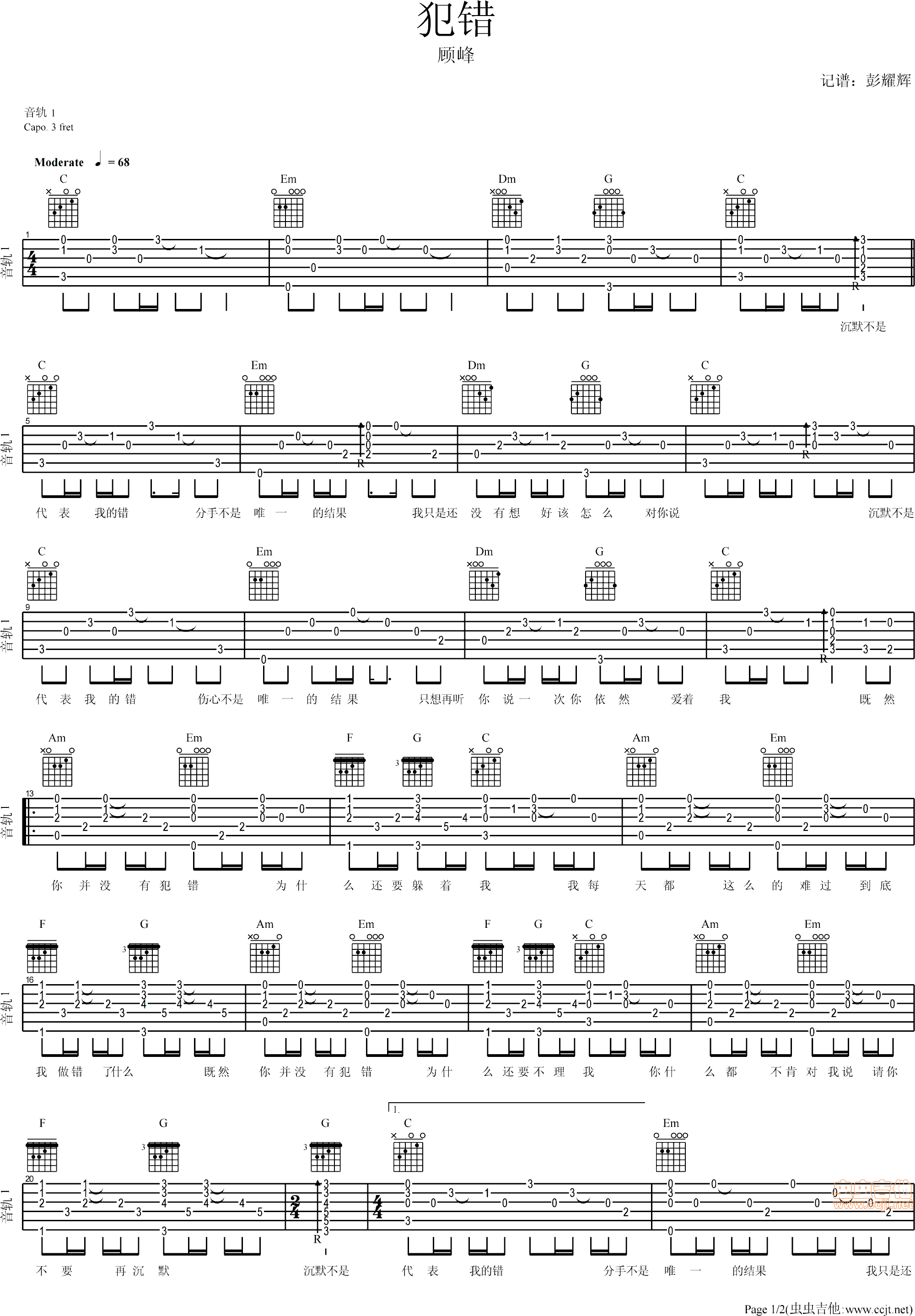 曲谱介绍: 《犯错》吉他弹唱谱,共有2张高清图谱,免翻页排版设计。