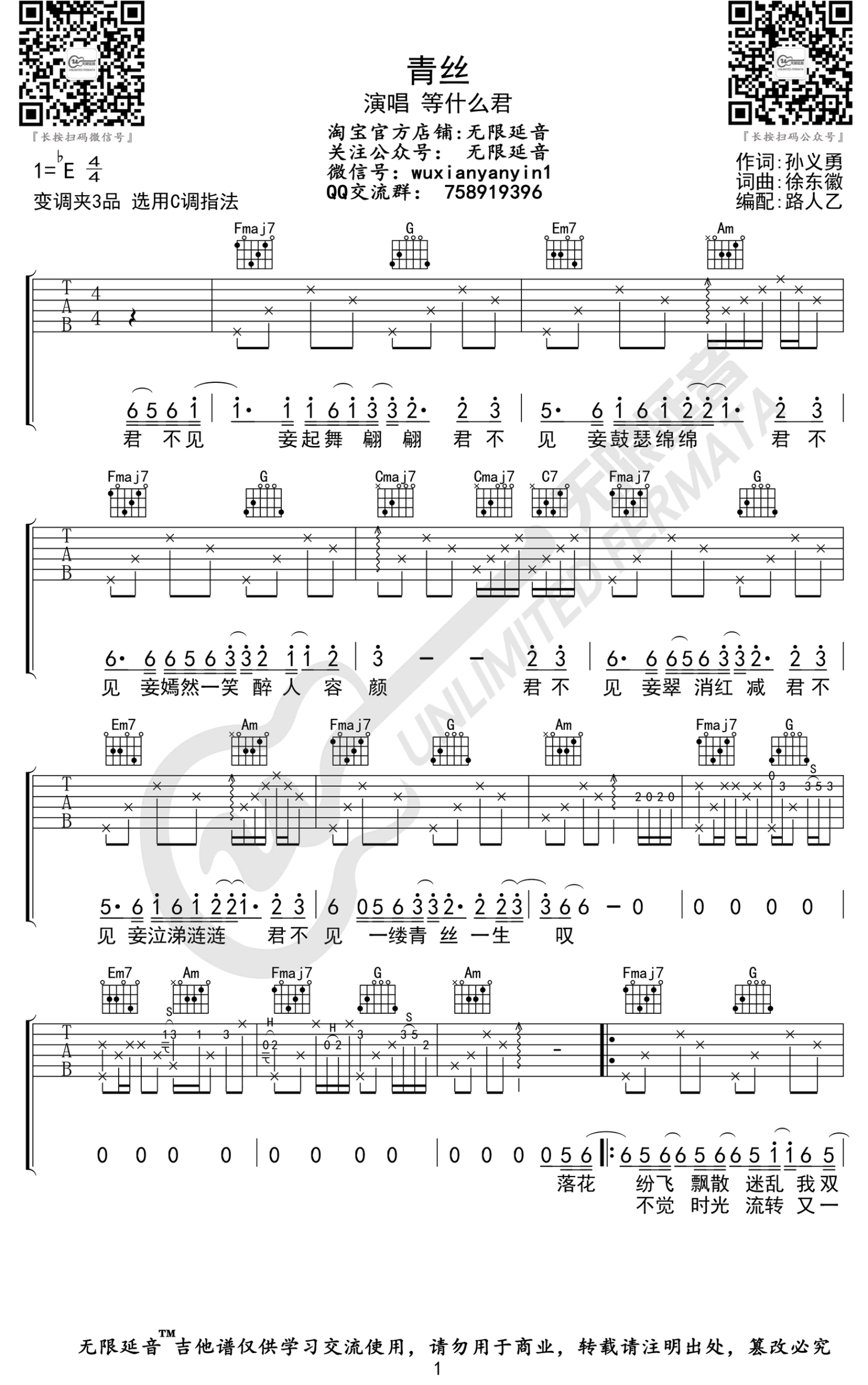 曲谱介绍: 等什么君《青丝》吉他谱,时间胶囊乐队原唱的一首古风歌曲,原调bE,选用C调指法,变调夹夹三品。青丝六线谱,三张高清图片谱。无限延音出品,打谱啦网吉他谱上传分享。唯美中国风歌曲让人欲罢不能,尤其是悠扬婉转行云流水的戏腔唱词,绾青丝亦是挽情思,青丝脉脉伴流年,任它风雨飘摇人生不惧。