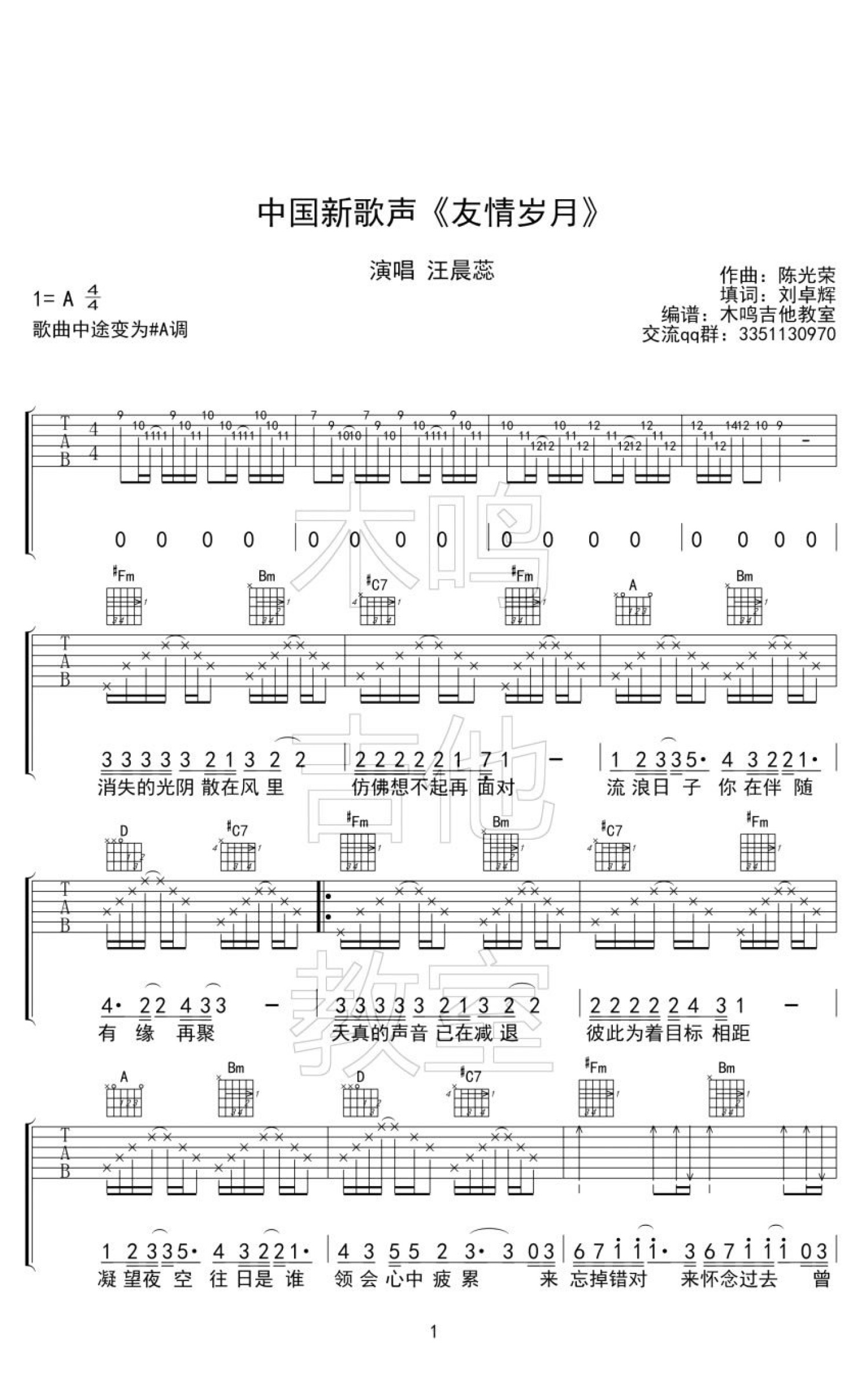 曲谱介绍: 汪晨蕊《友情岁月》吉他谱_吉他弹唱谱_女生版