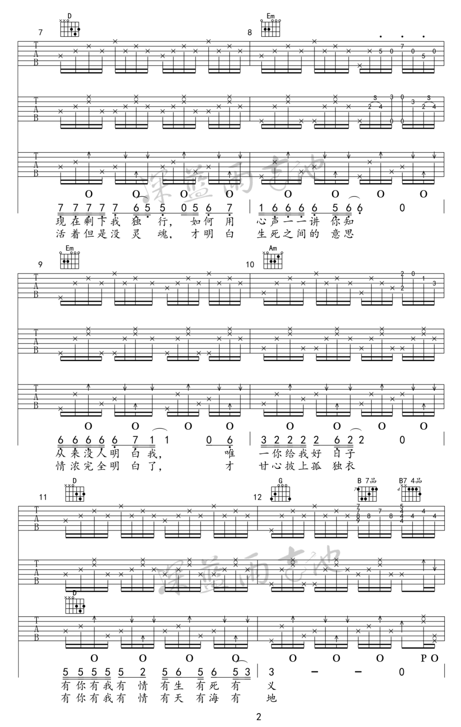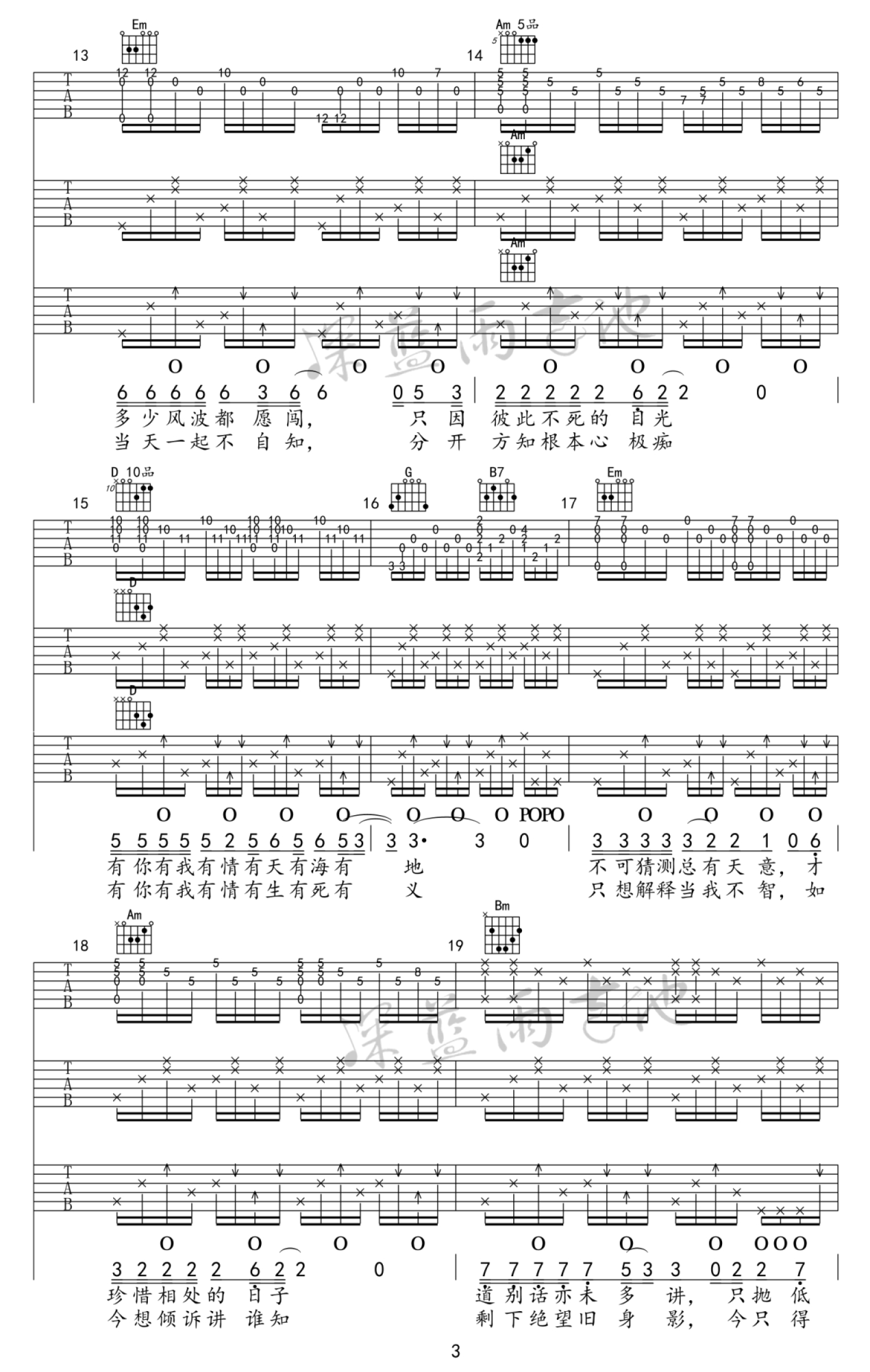 曲谱介绍: 演奏提示:第一段演奏的时候要注意把一些小型过渡旋律演奏突出;第二段要把贝斯低音弹稳;第三段过渡的时候打板有一定的难度,基础不好的朋友可以忽略打板,直接按照前奏这么演奏。这是一首比较有难度的弹唱歌曲,需要多加练习。