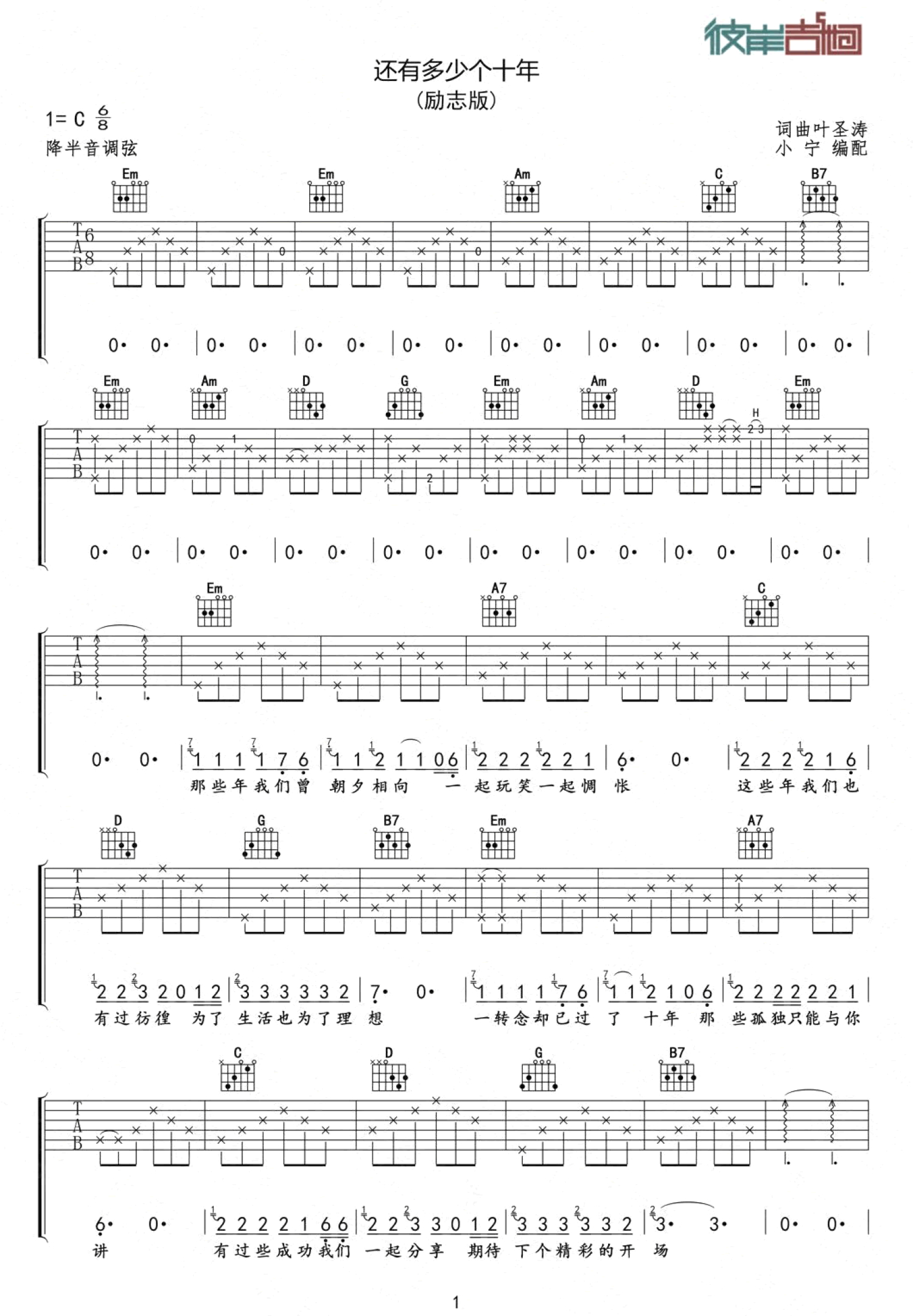 曲谱介绍: 《还有多少个十年》吉他谱,叶圣涛演唱,综艺真人秀节目《两天一夜》第二季主题曲,还有多少个十年六线谱,C调,降半音调弦,高清弹唱图片谱,《爸爸去哪儿》的词曲作者叶圣涛的一首励志歌曲,充满了追逐梦想的热情和勇气。还有多少个十年,勇敢做热血青年,让我们随着歌声,踏上全新的旅程。