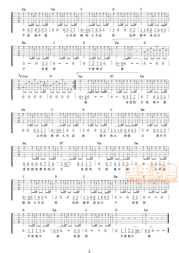 曲谱介绍: 《亲爱的不要离开我》吉他弹唱谱,共有2张高清图谱,免翻页排版设计。