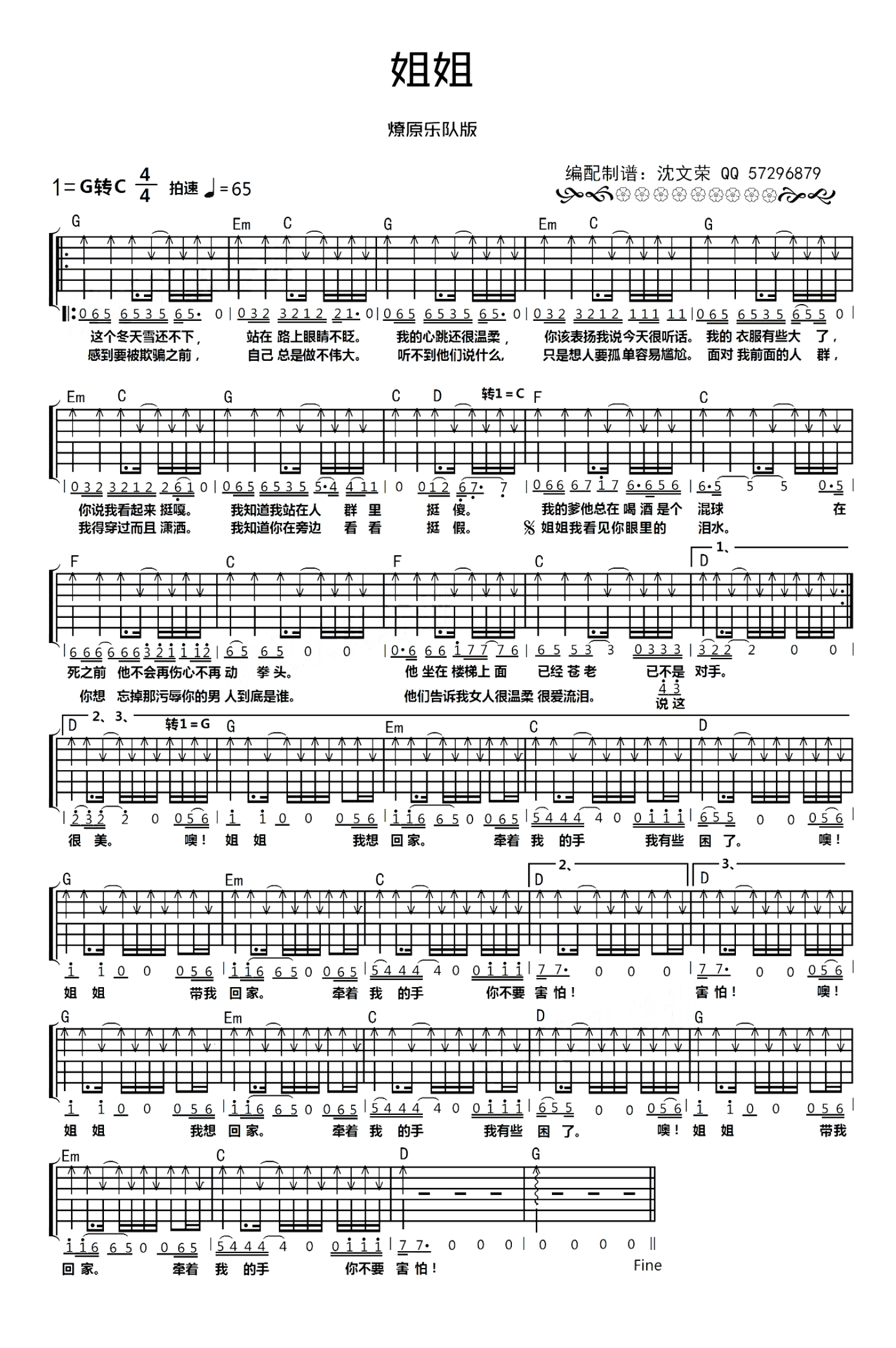曲谱介绍: 张楚姐姐吉他谱,G转C调,改编自燎原乐队版。姐姐六线谱,高清图片弹唱谱。一颗赤子之心唱着一首充满着人文情怀的歌曲。我相信大多数的男人,会在他的成长阶段遇到一个姐姐,我指的是精神意义上的姐姐。一个男人因此产生的依恋、反叛、长大、独立、保护欲,在这首歌里表达得如此传神和艺术。