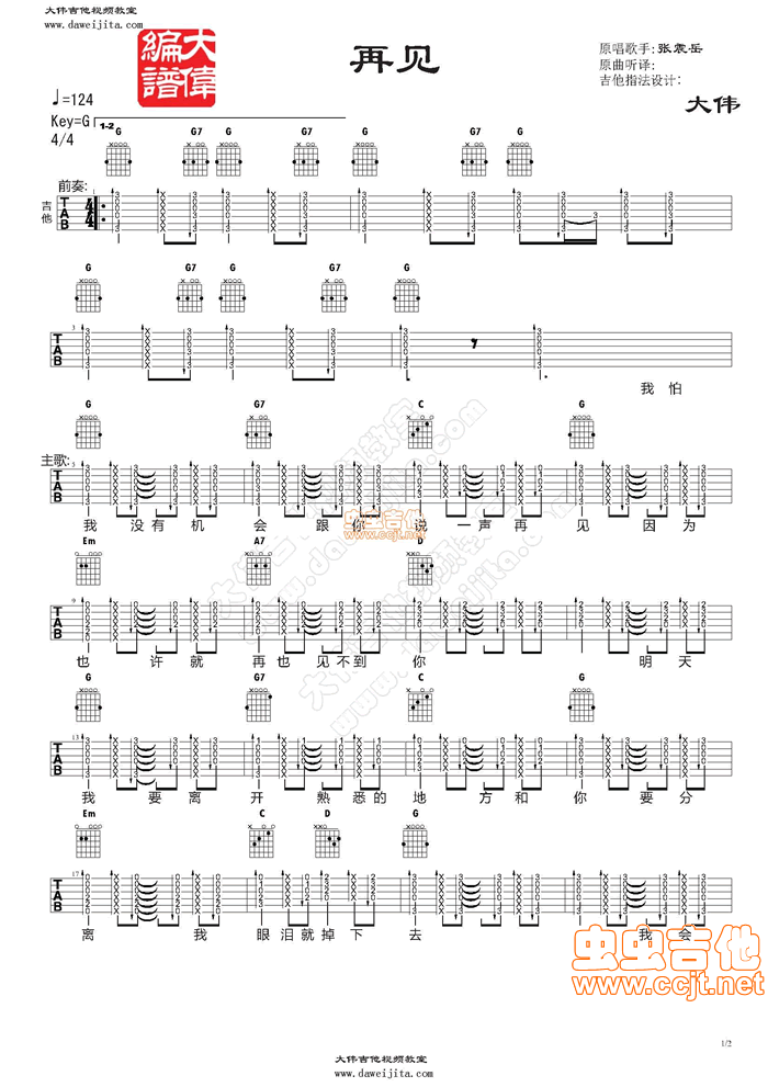 曲谱介绍: 张震岳《再见》吉他弹唱谱,共有2张高清图谱,免翻页排版设计。