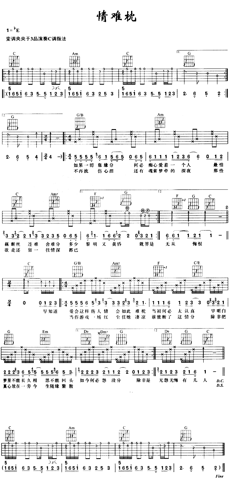 曲谱介绍: 《情难枕》吉他弹唱谱,共有1张高清图谱,免翻页排版设计。