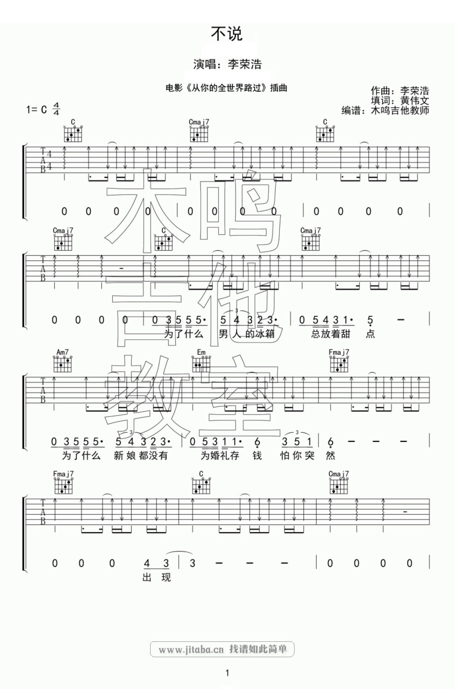 不说吉他谱 - 李荣浩 - C调吉他弹唱谱