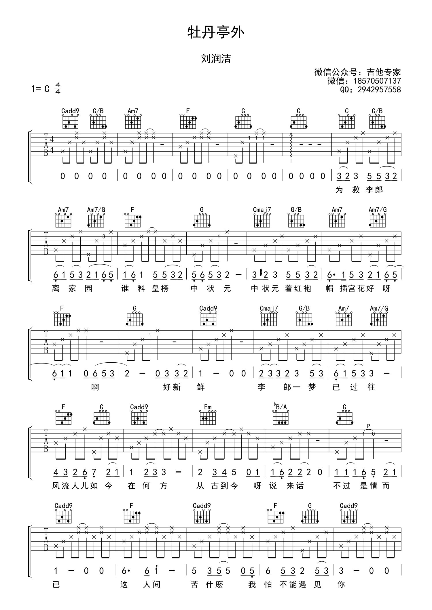 牡丹亭外吉他谱 - 刘润洁 - C调吉他弹唱谱
