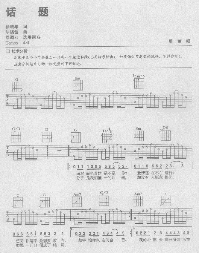 曲谱介绍: 话题《话题》吉他弹唱谱,共有2张高清图谱,免翻页排版设计。