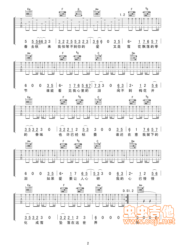 曲谱介绍: 《谁还在意我流下的泪》吉他弹唱谱,共有2张高清图谱,免翻页排版设计。