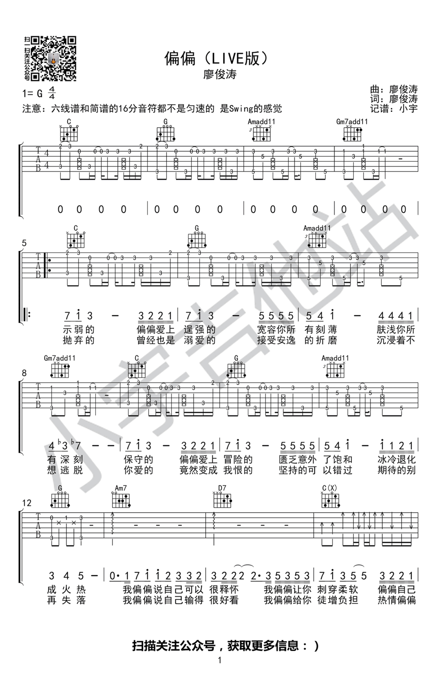 偏偏吉他谱 - 廖俊涛 - G调吉他弹唱谱
