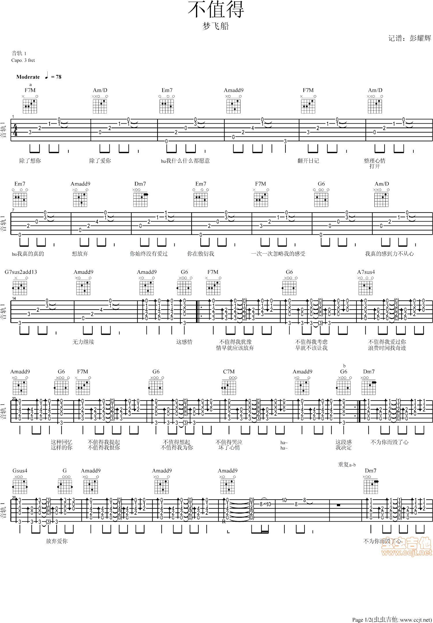 曲谱介绍: 《不值得》吉他弹唱谱,共有2张高清图谱,免翻页排版设计。