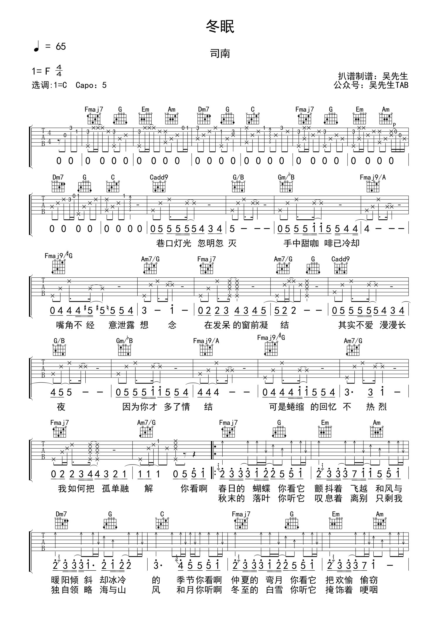 曲谱介绍: 司南《冬眠》吉他谱_C调吉他弹唱谱