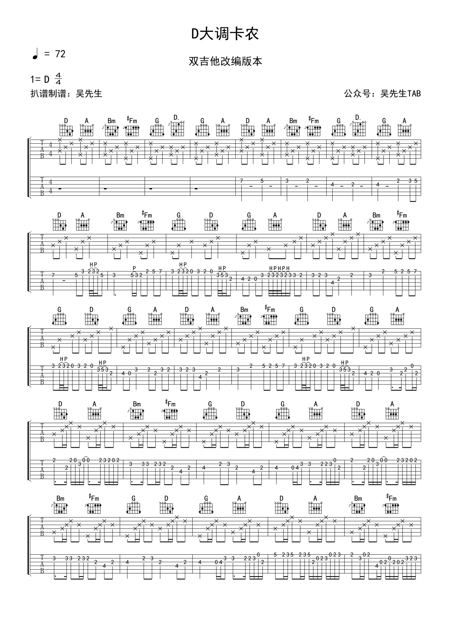 D大调卡农吉他谱 - D调吉他独奏谱 - 双吉他改编版本