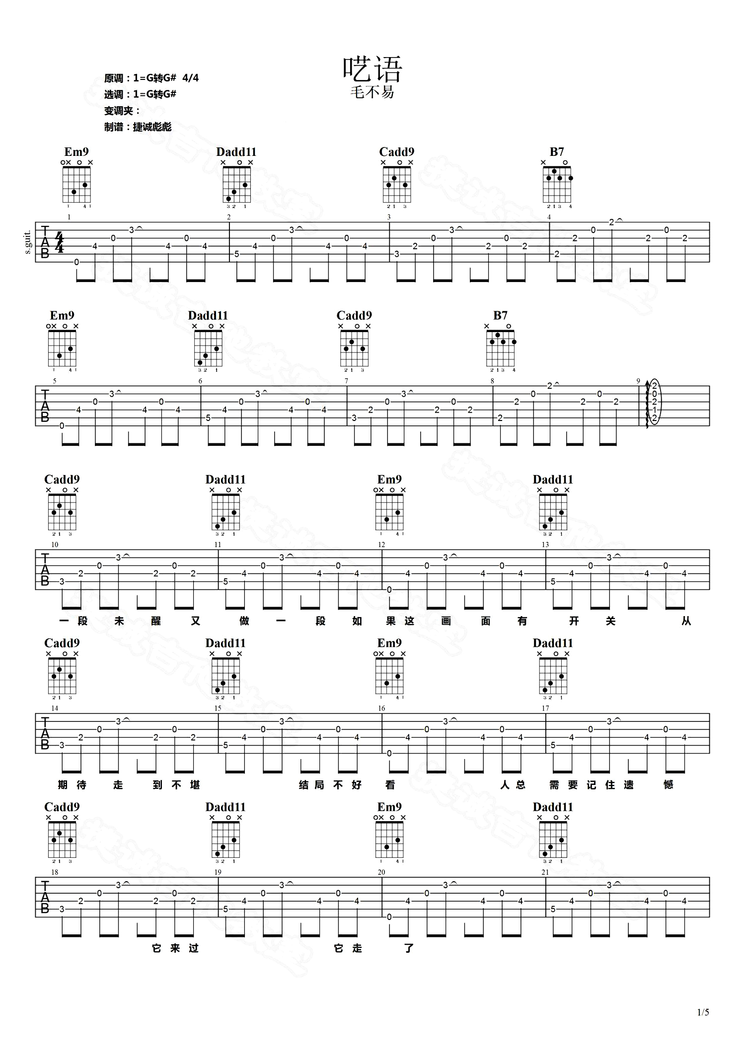 曲谱介绍: 毛不易《呓语》吉他谱_G调吉他弹唱谱