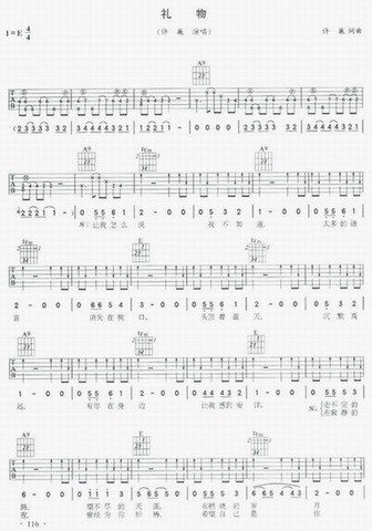 曲谱介绍: 《礼物1》吉他弹唱谱,共有1张高清图谱,免翻页排版设计。