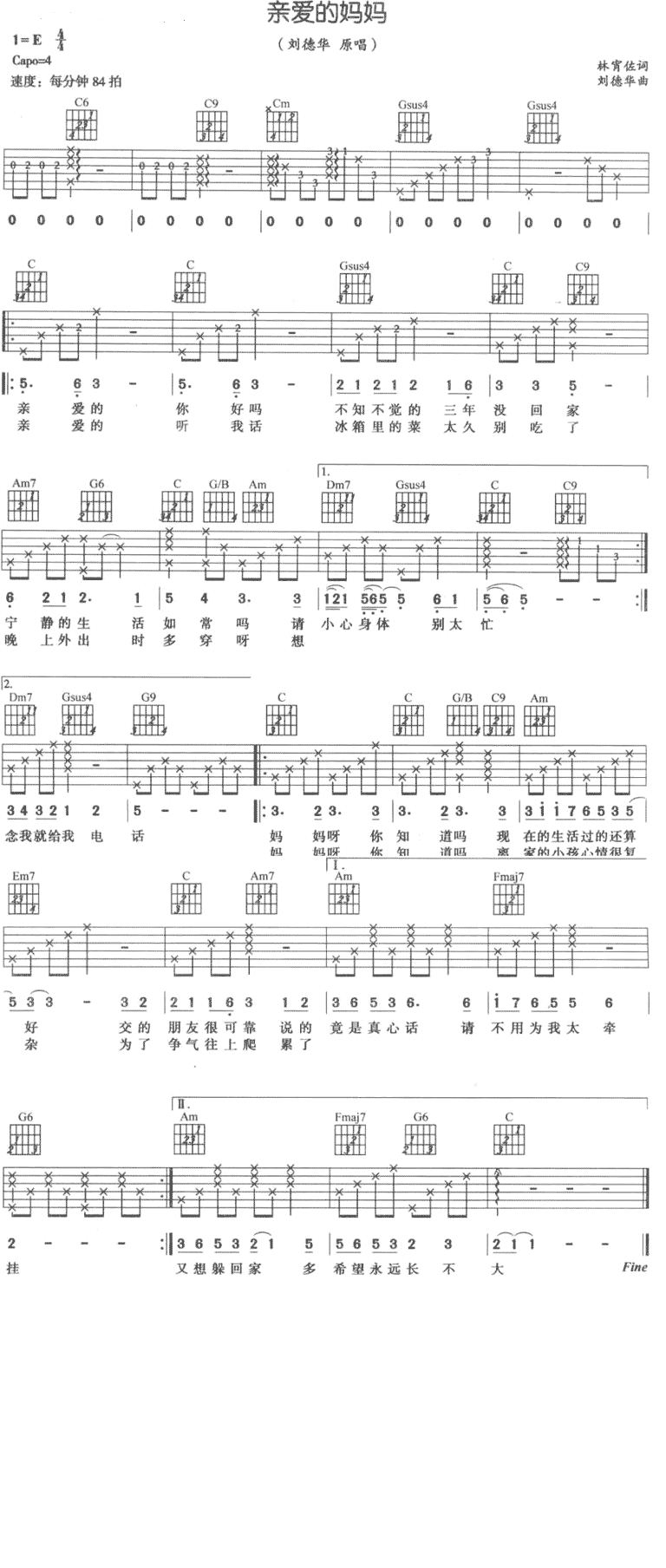 亲爱的妈妈吉他谱 - 吉他弹唱谱
