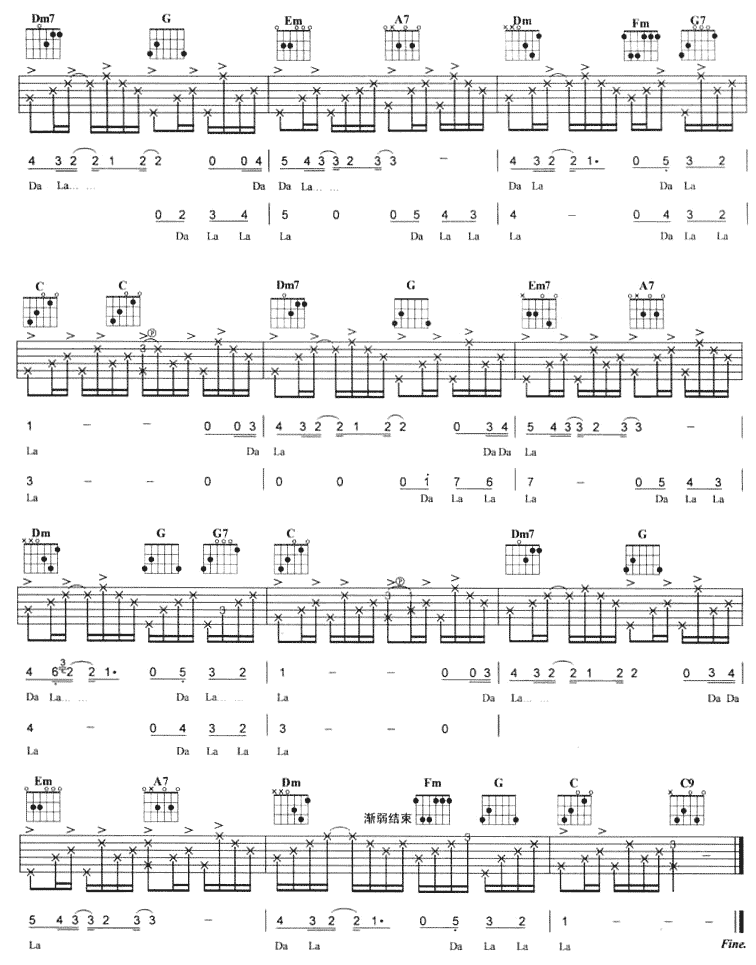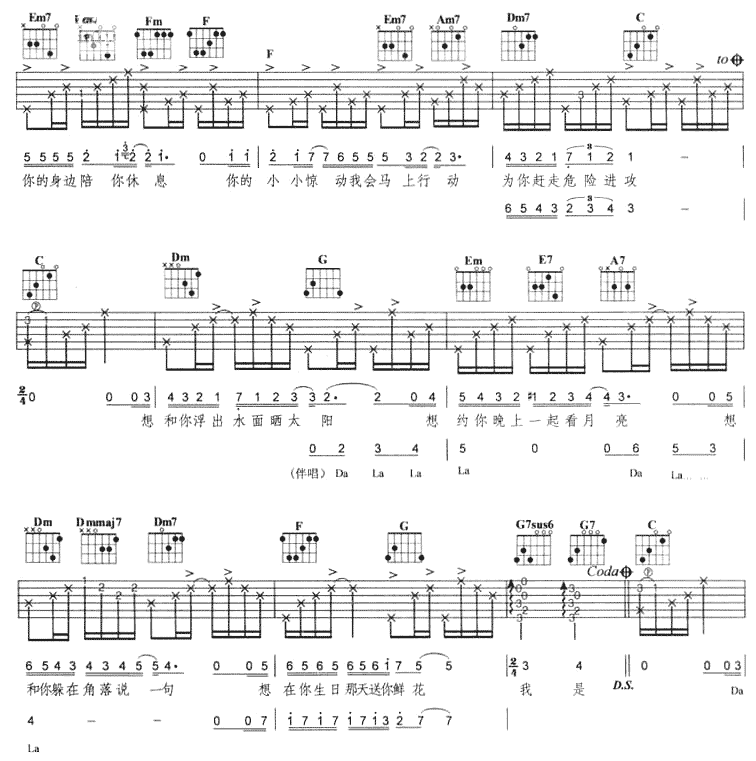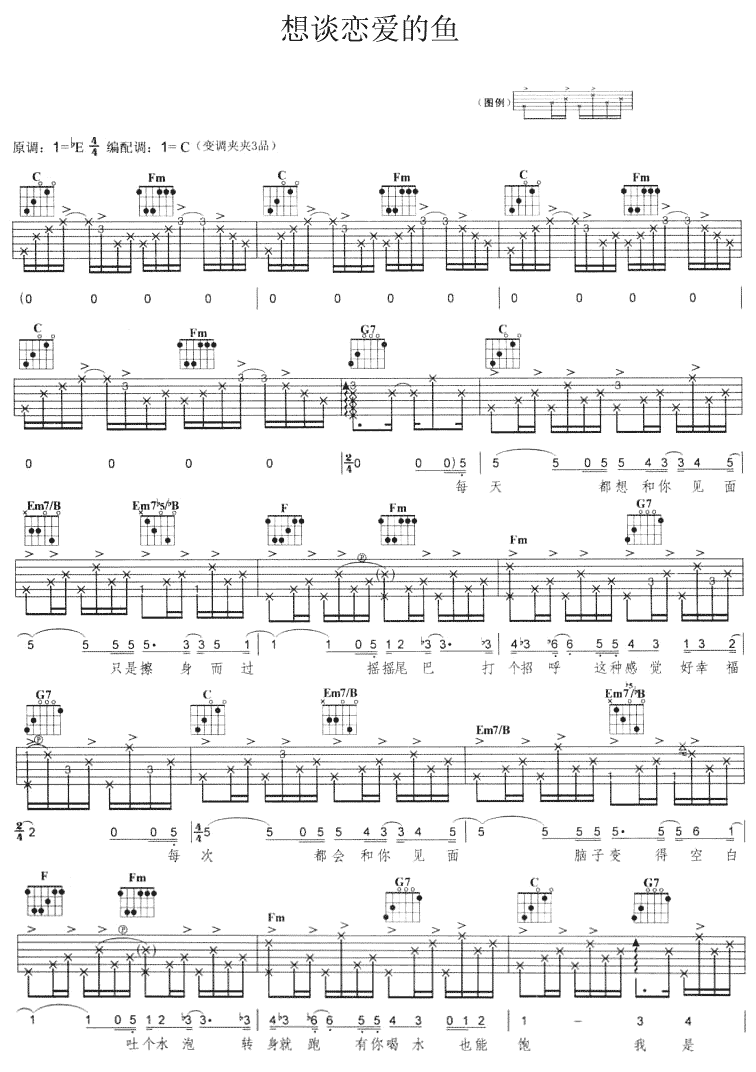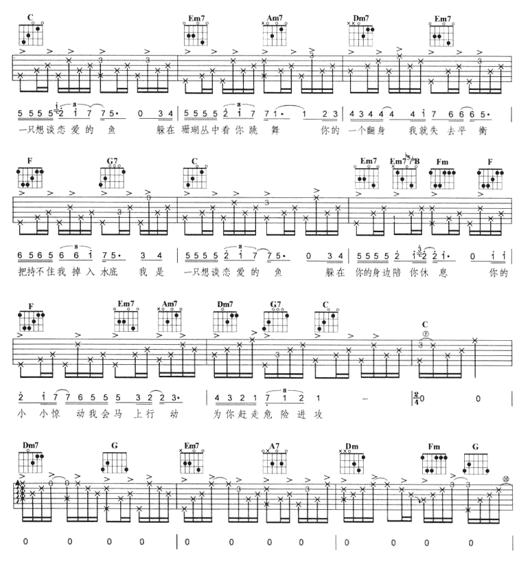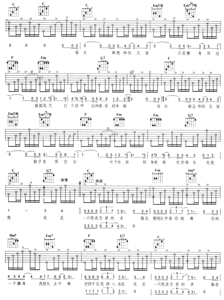 曲谱介绍: 《想谈恋爱的鱼》吉他弹唱谱,共有5张高清图谱。