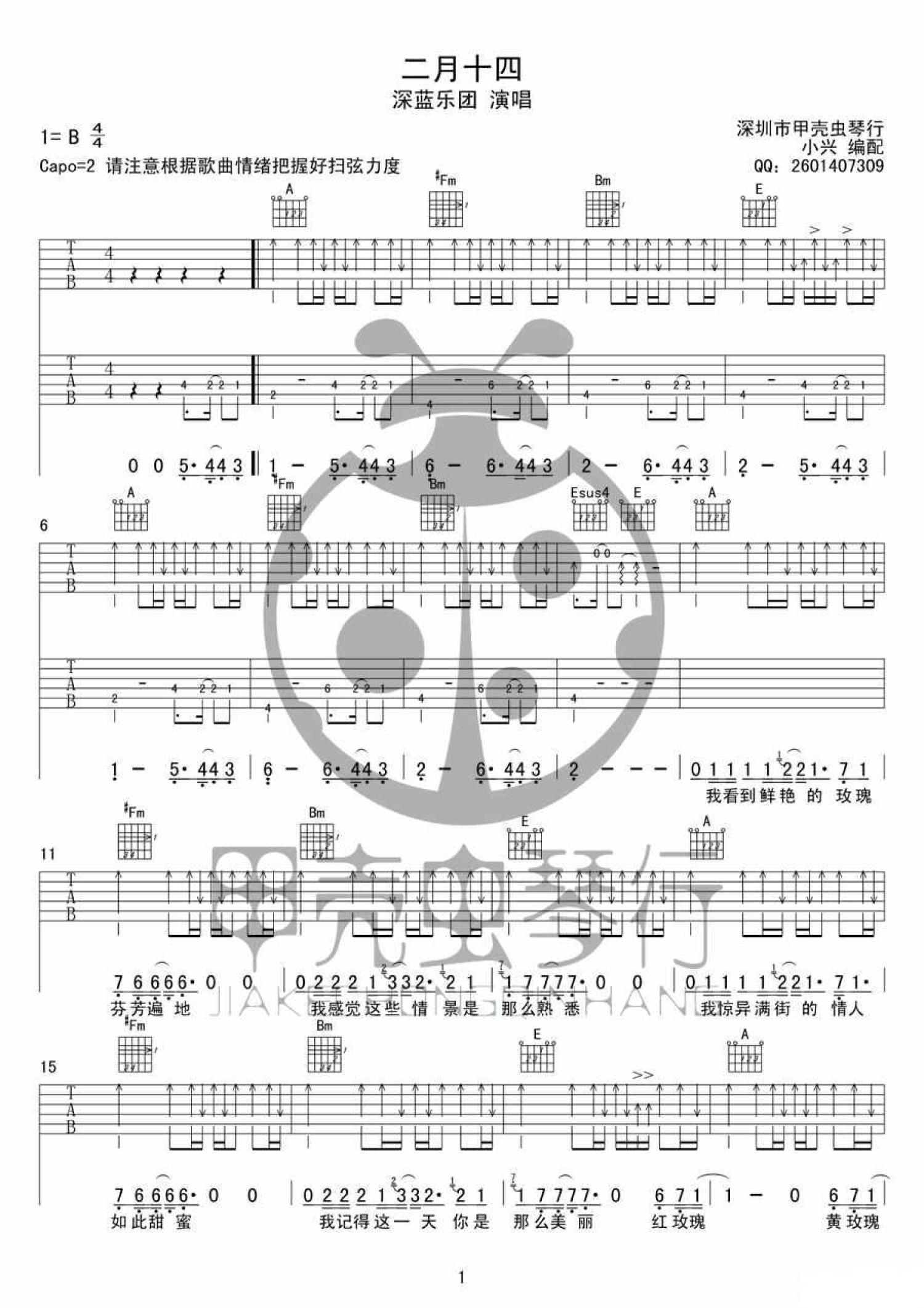 曲谱介绍: 深蓝乐团《二月十四》吉他谱_B调吉他弹唱谱