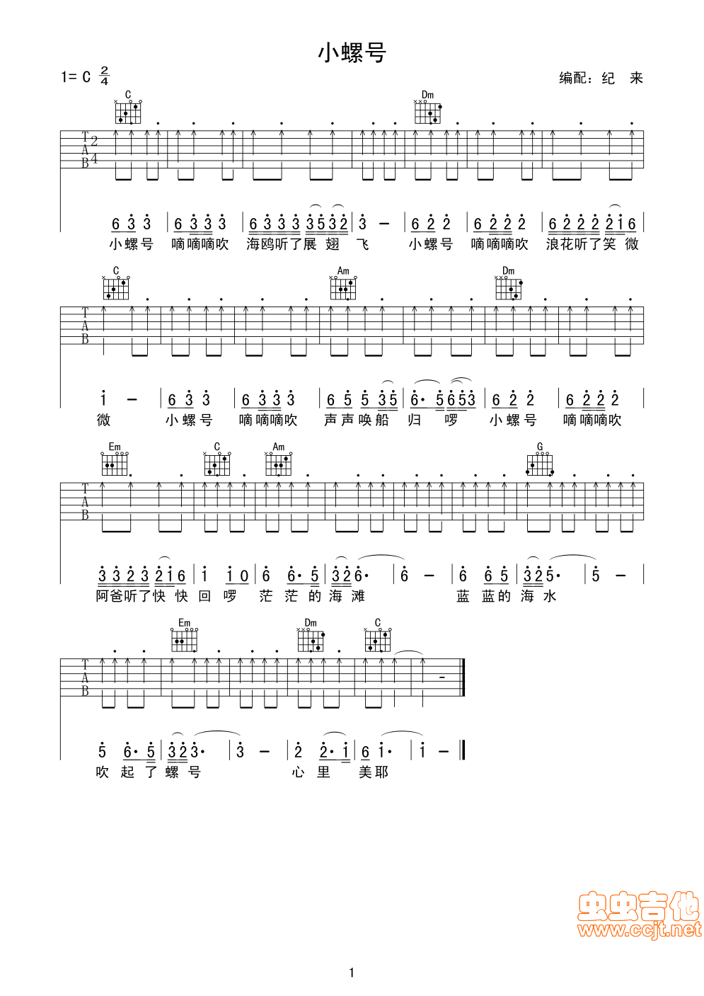 曲谱介绍: 《小螺号(儿童)》吉他弹唱谱,共有1张高清图谱,免翻页排版设计。
