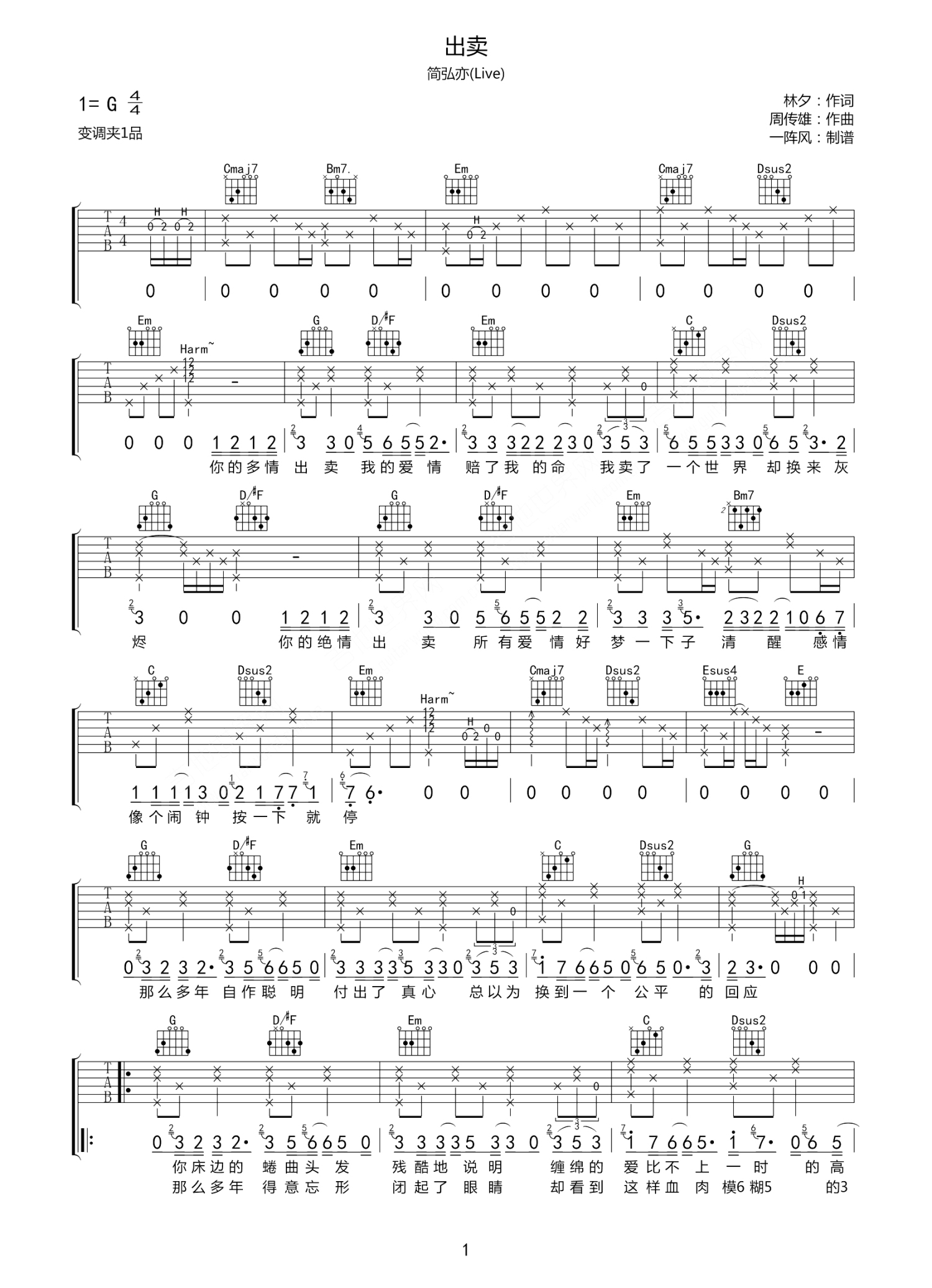出卖吉他谱 - 简弘亦 - G调吉他弹唱谱