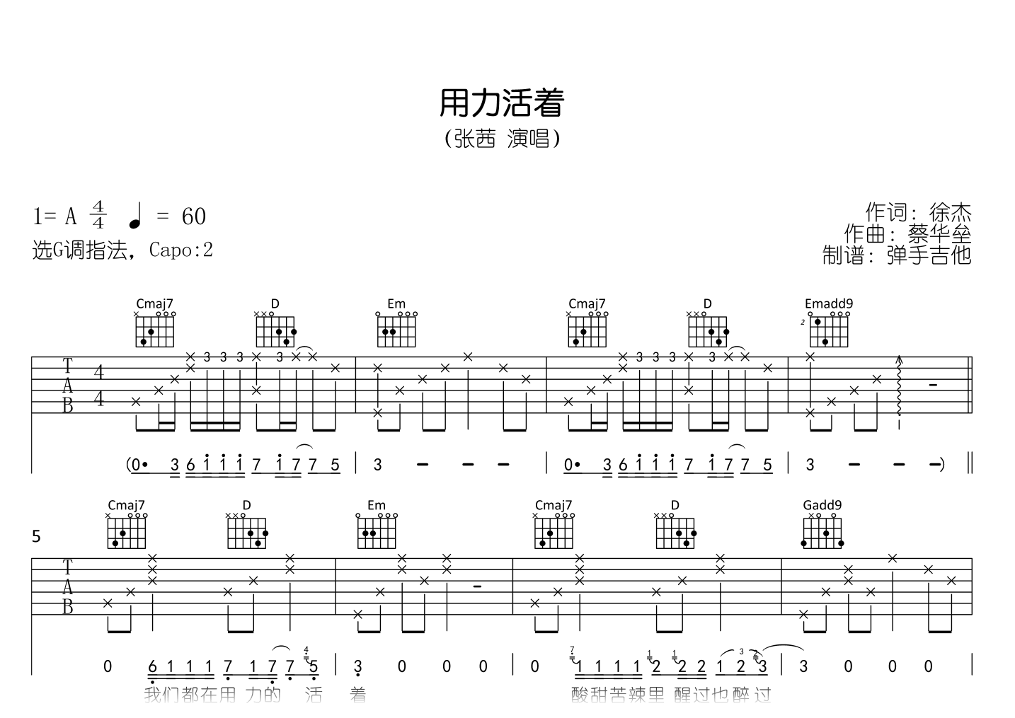 用力活着吉他谱 - 张茜 - G调吉他弹唱谱 - 原版