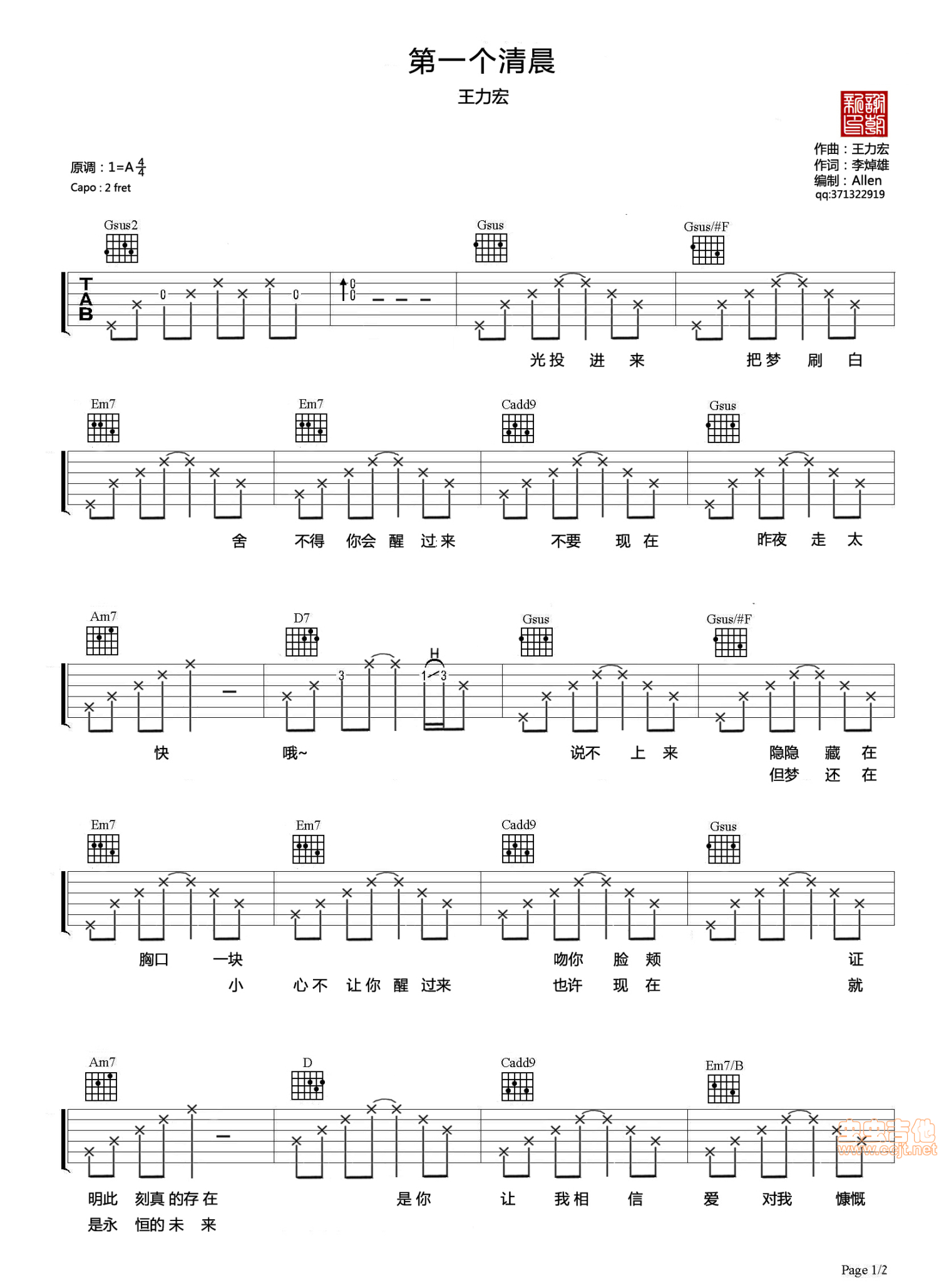 第一个清晨吉他谱 - 王力宏 - A调吉他弹唱谱