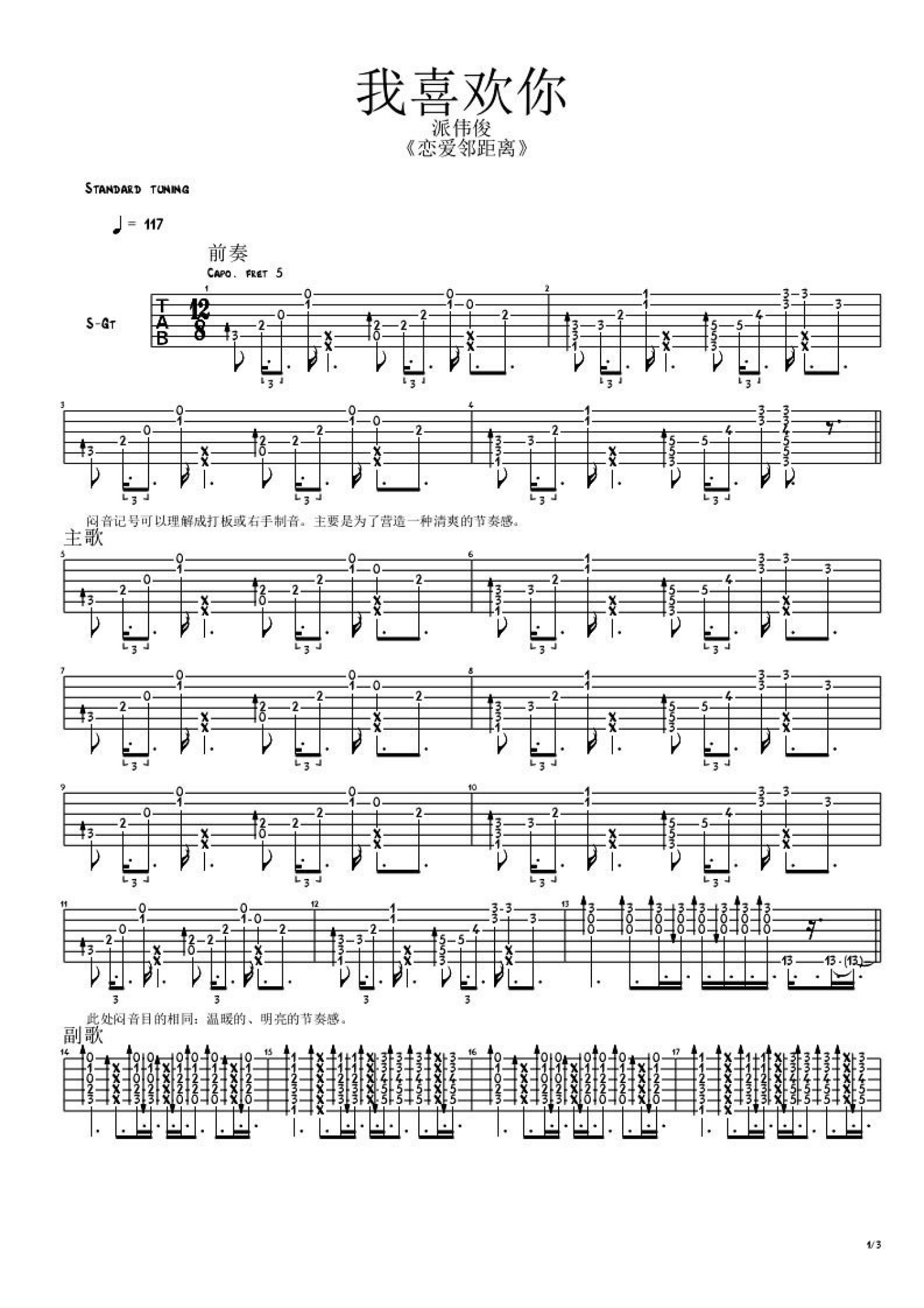 我喜欢你吉他谱 - 派伟俊 - 吉他独奏谱 - 双吉他