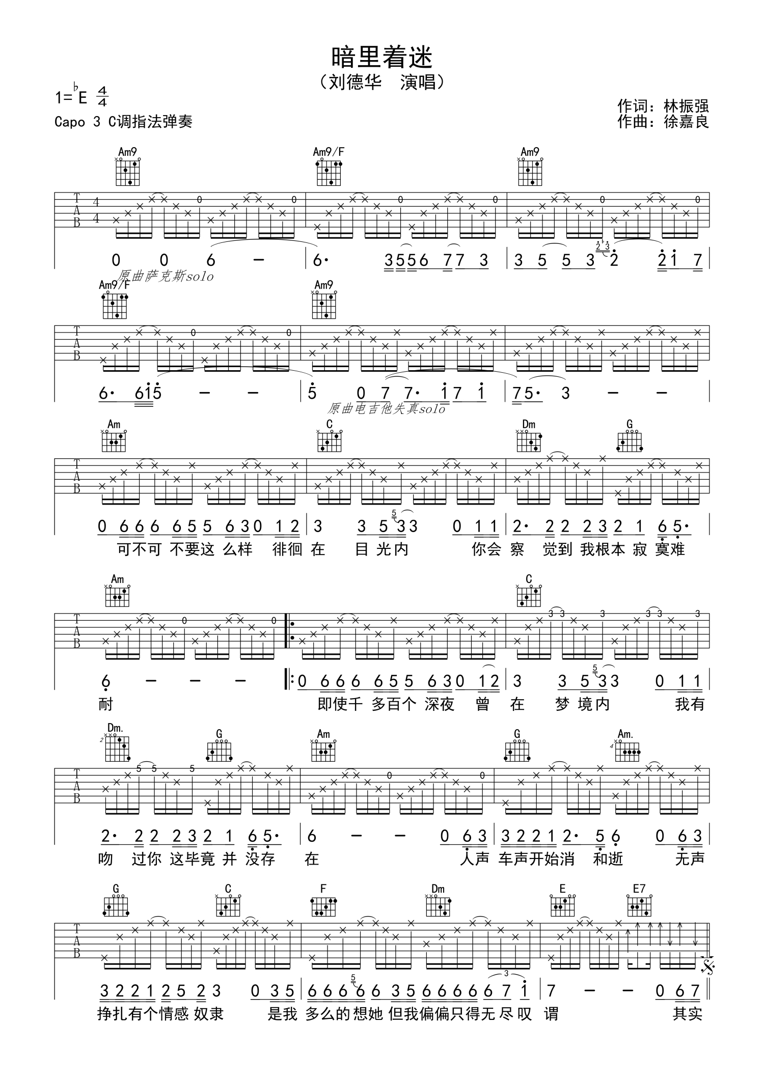 曲谱介绍: 刘德华《暗里着迷》吉他谱_C调吉他弹唱谱