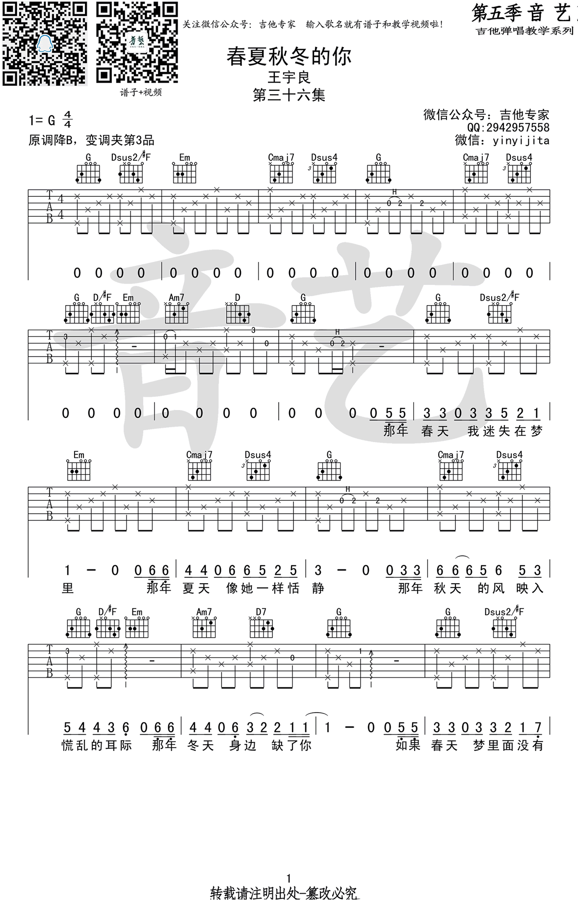 曲谱介绍: 王宇良《春夏秋冬的你》吉他谱,原调降B,变调夹夹第三品,选用G调指法,春夏秋冬的你吉他弹唱谱,高清六线谱编配,三张图片谱。感谢音艺吉他出品,91吉他谱网站整理上传。 95后创作人王宇良的音乐作品,演绎岁月和你久伴不离,歌曲登上各大音乐平台各排行榜。