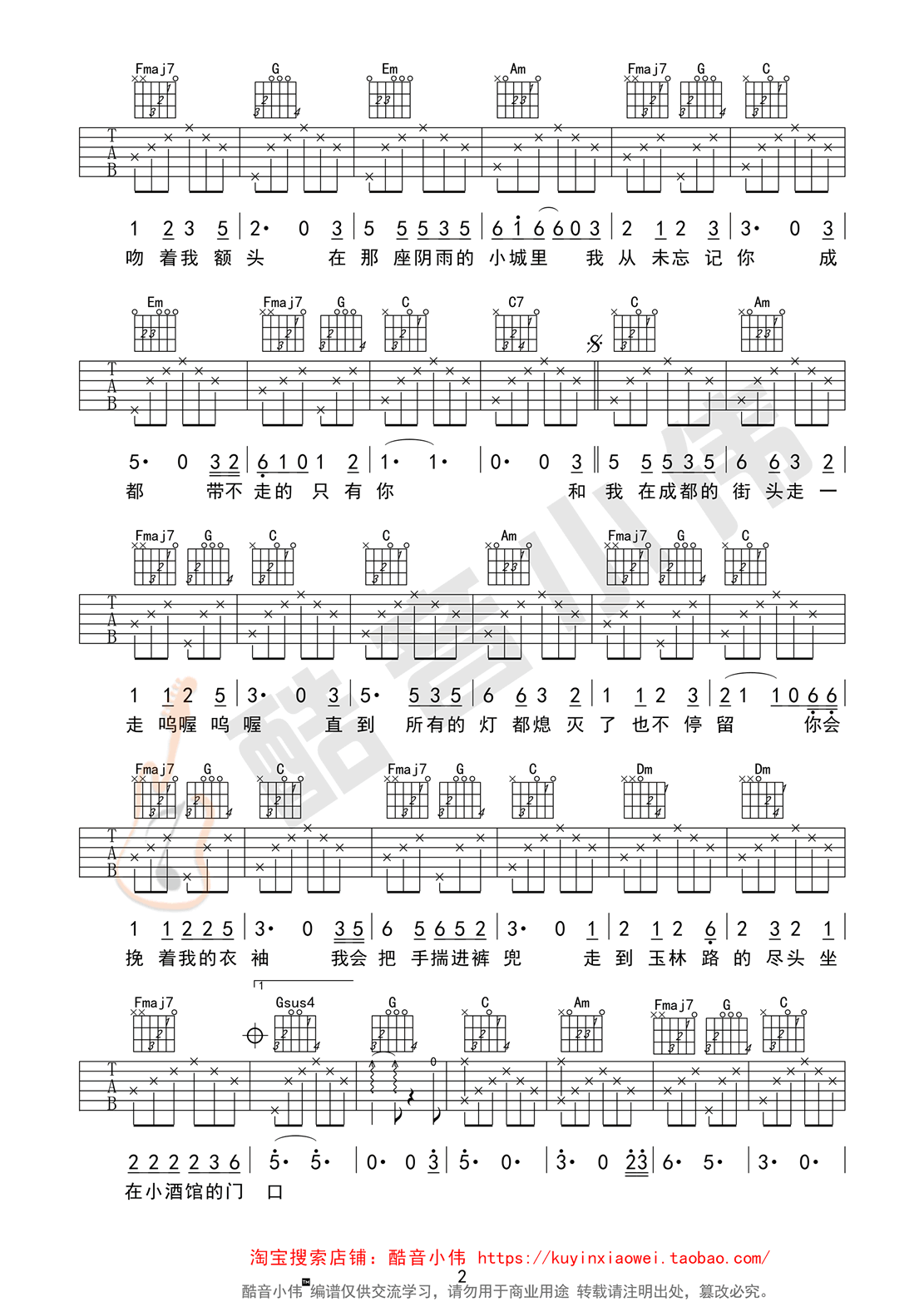 曲谱介绍: 成都吉他谱,C调弹唱谱简单版,赵雷《成都》吉他六线谱,原调D,选调C,变调夹男生建议0-5品,女生不夹或降半音调弦,本曲谱为初级版,酷音小伟编配。