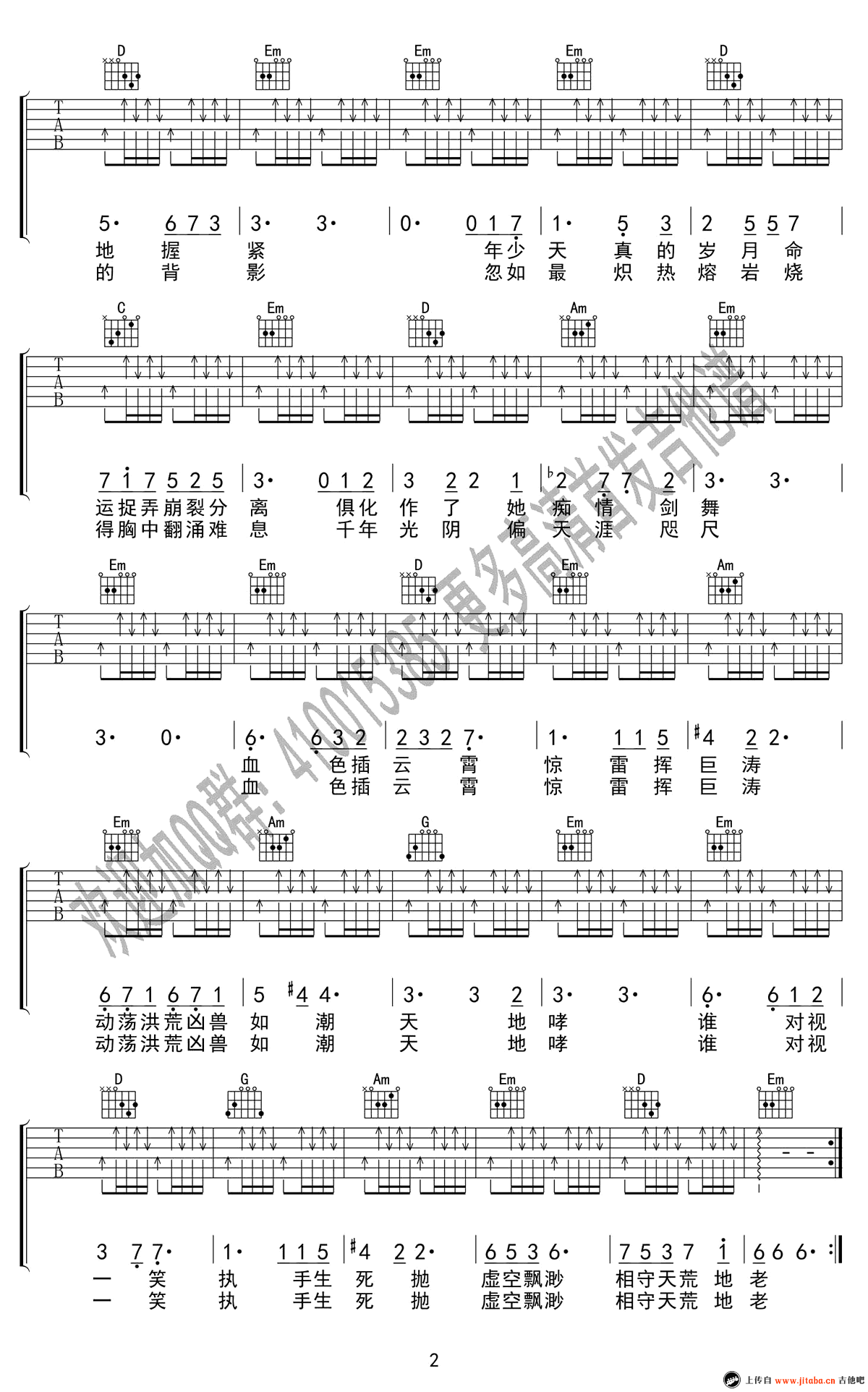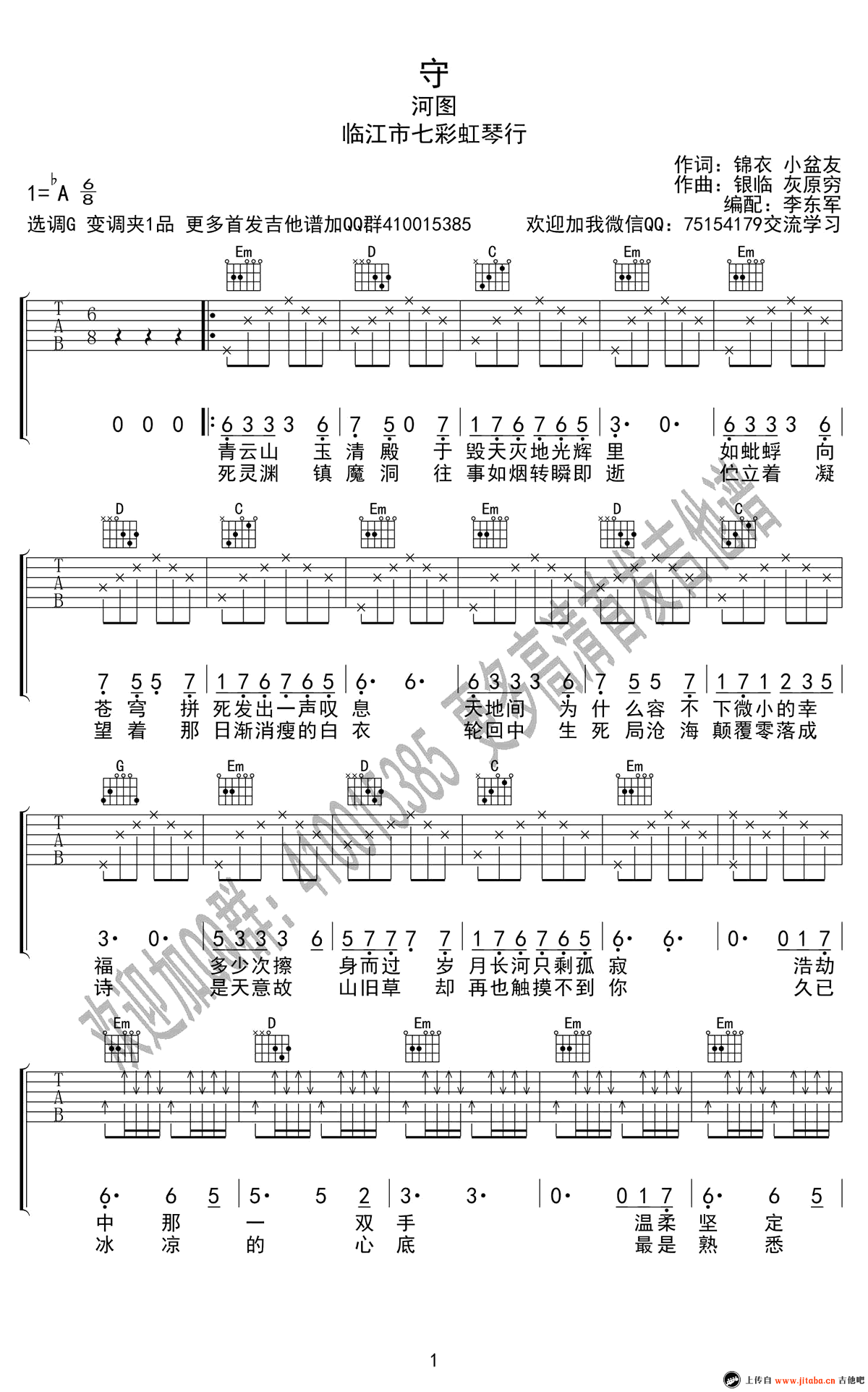 曲谱介绍: 《守》吉他谱,河图演唱,选调G,变调夹夹第一品,守吉他弹唱谱,《诛仙世界》官方推介歌曲,七彩虹琴行出品,李东军编配,91吉他谱www.jitaba.cn上传分享。 想念却无法相守,执手却又有天涯。千年流转,生死爱恋,唯美的中国风元素的词曲勾画出一幅《诛仙世界》的故事,讲述了经历为爱千年的守候,却又无奈错过的遗憾。