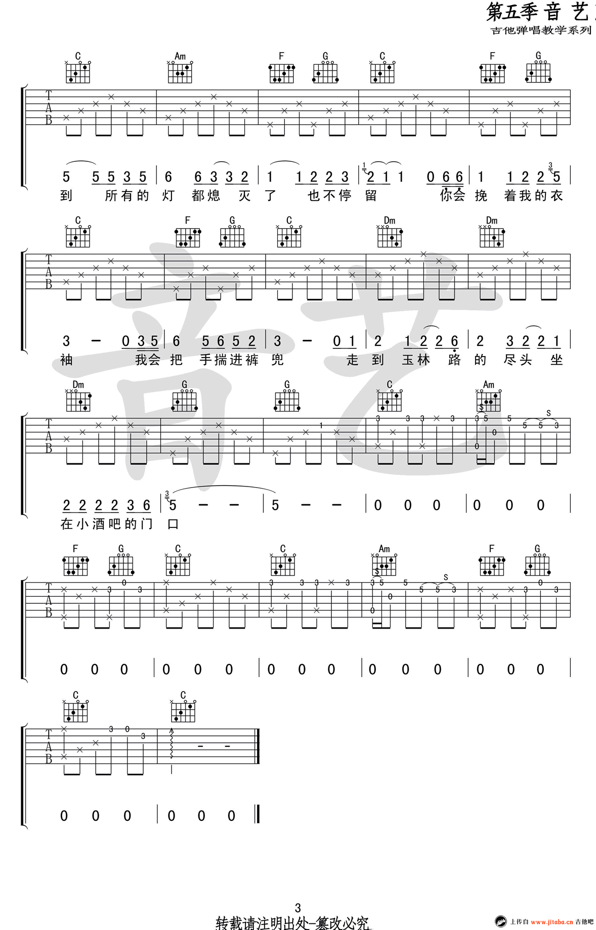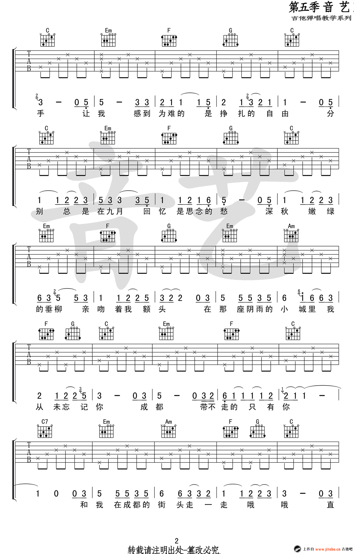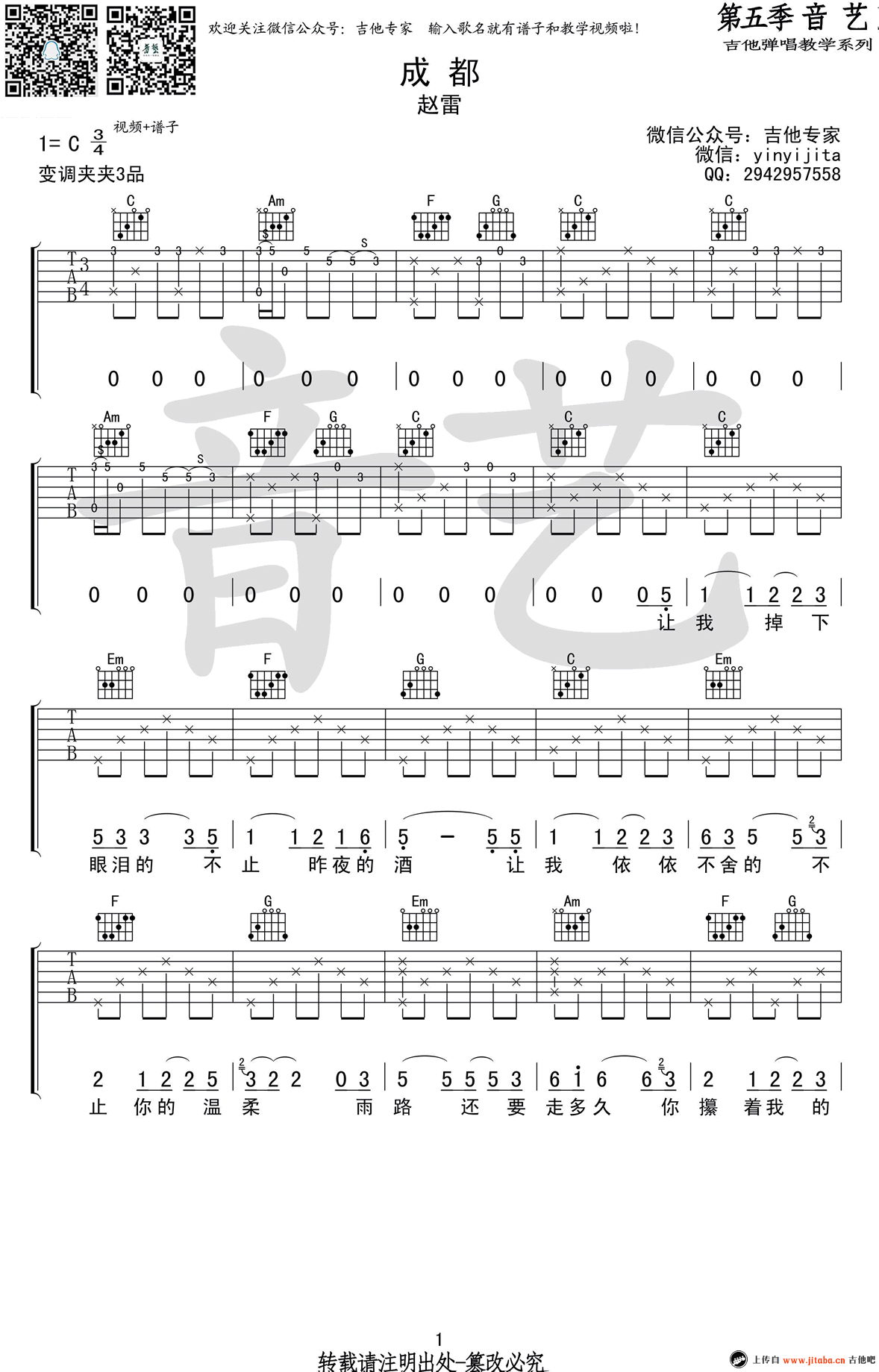 曲谱介绍: 赵雷《成都》吉他谱,C调指法编配,变调夹夹三品。成都六线谱,高清弹唱谱三张图片谱例,音艺吉他原版编配分享,91吉他谱网站整理上传。 很多听过这首歌的人,看《我是歌手》时依旧是感动的!从小到大,我们经历过很多,时间过去了,但是很多东西是带不走的;很多人离开了,但是关于他们的记忆还停留在那里,每一次触碰都能让你思绪翻涌。对你的思念,不止曾经走过的玉林路;为你掉下的眼泪,也不止是昨夜喝的酒。